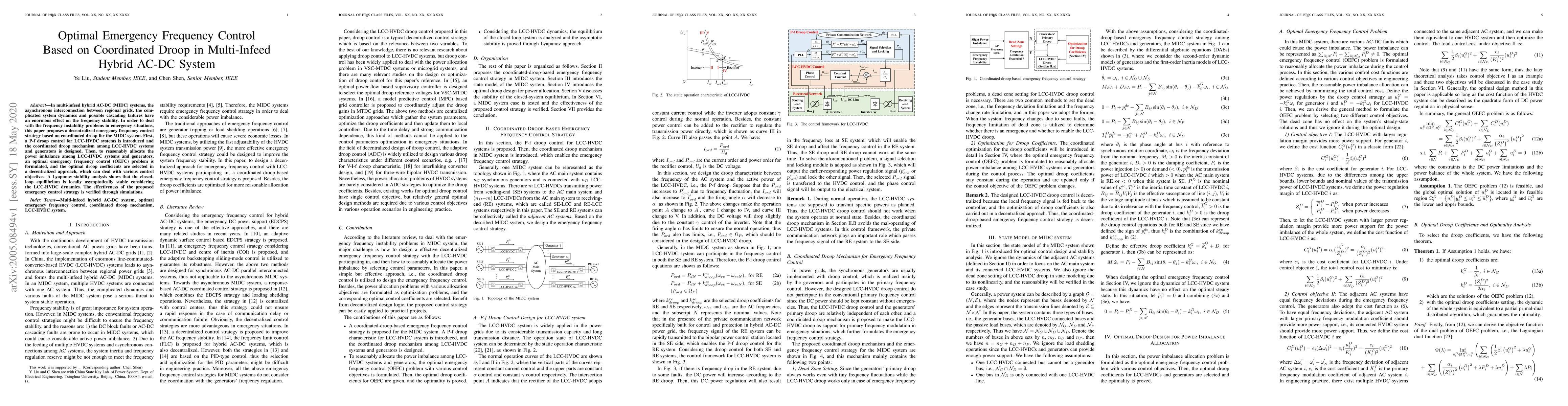 This paper proposes a decentralized emergency frequency control strategy based on coordinated droop for multi-infeed hybrid AC-DC systems, addressing frequency instability through optimal droop coefficients and stability analysis, validated by simulations.
