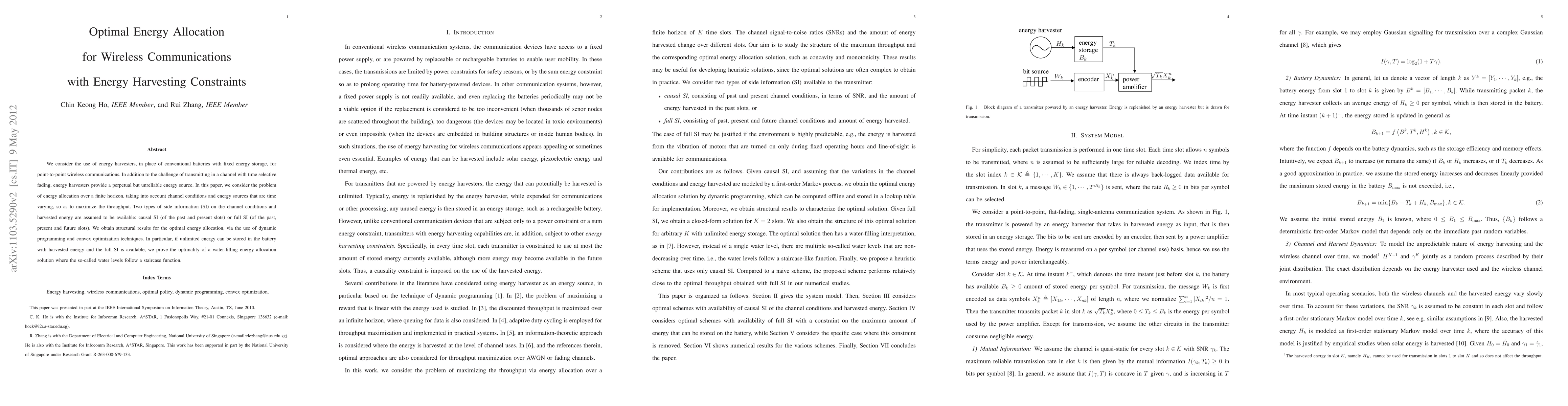 Researchers developed a method to optimize energy allocation for wireless communications with intermittent energy sources, maximizing throughput while considering channel conditions and available side information. The solution involves a water-filling energy allocation strategy that adapts to changing channel conditions.