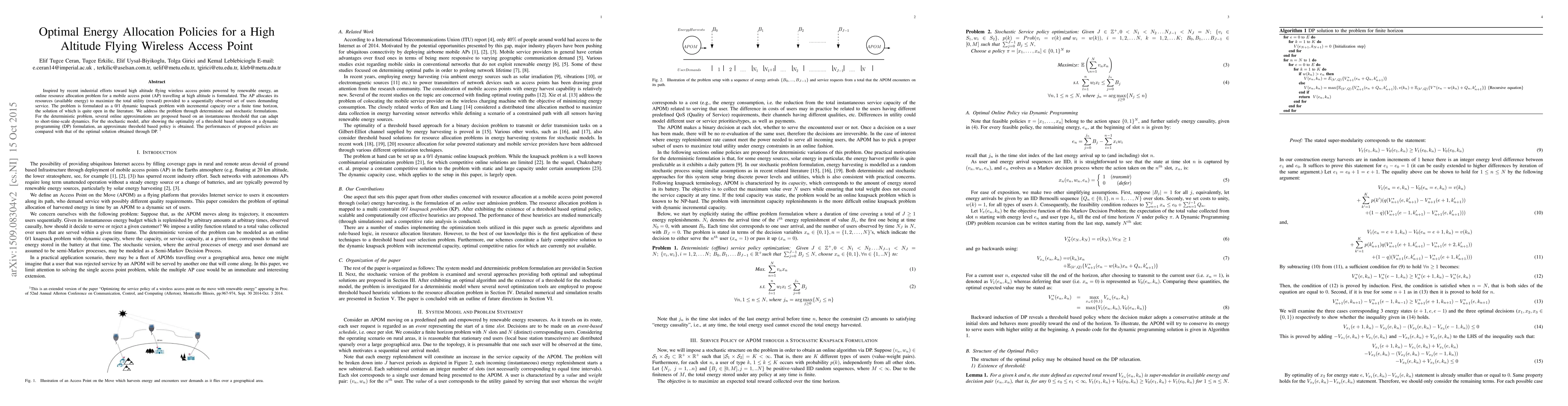 Researchers developed optimal energy allocation policies for high-altitude flying wireless access points using deterministic and stochastic formulations. Their methods provide new solutions to the 0/1 dynamic knapsack problem, enabling efficient resource management in high-altitude mobile networks.