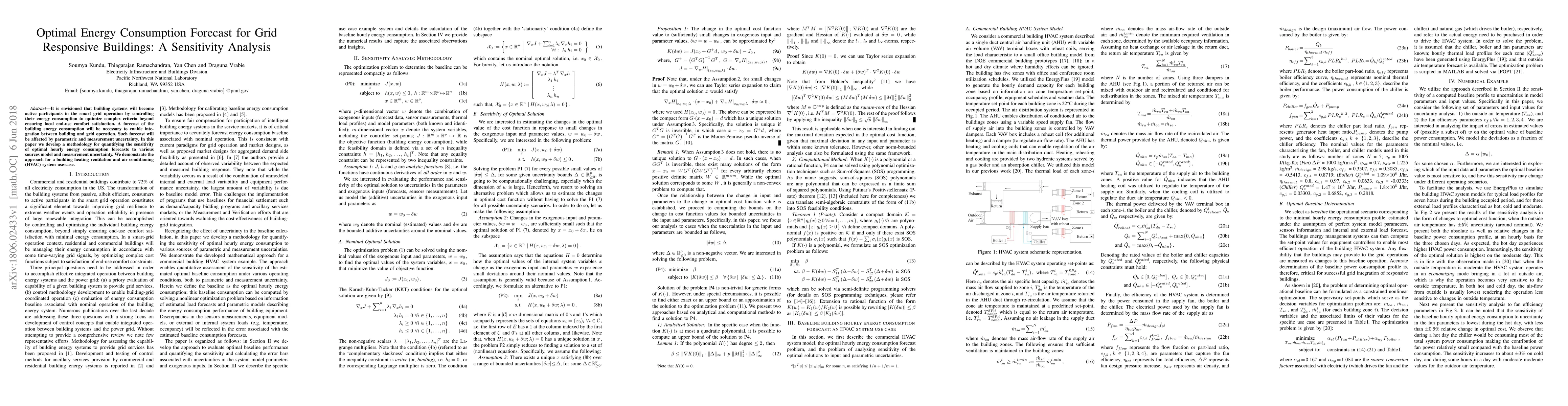 It is envisioned that building systems will become active participants in the smart grid operation by controlling their energy consumption to optimize complex criteria beyond ensuring local end-use comfort satisfaction. A forecast of the building energy consumption will be necessary to enable integration between building and grid operation. Such forecast will be affected by parametric and measurement uncertainty. In this paper we develop a methodology for quantifying the sensitivity of optimal hourly energy consumption forecasts to various sources model and measurement uncertainty. We demonstrate the approach for a building heating ventilation and air conditioning (HVAC) system use-case.