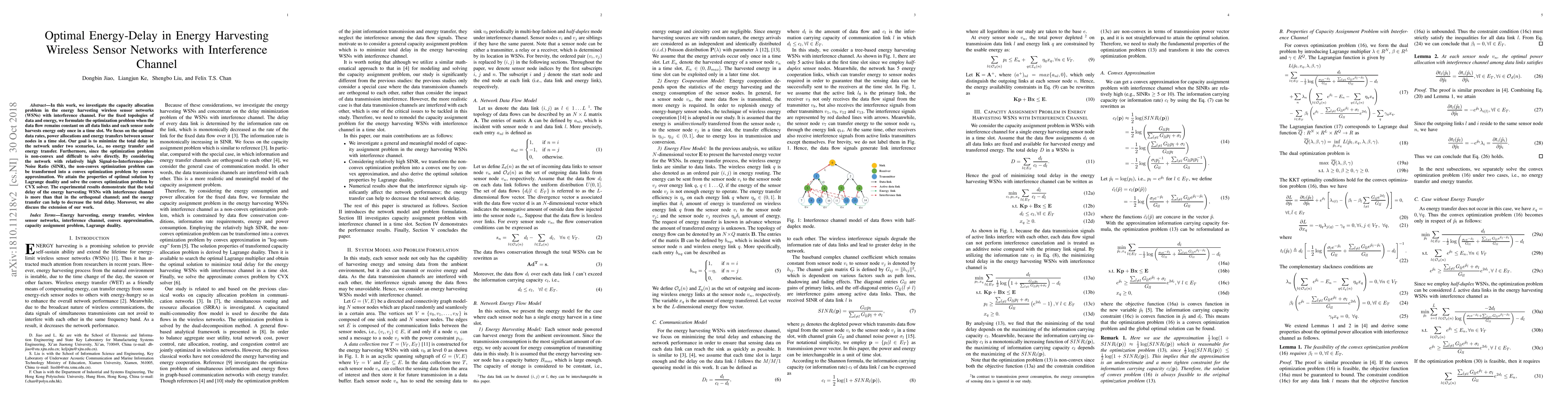 In this work, we investigate the capacity allocation problem in the energy harvesting wireless sensor networks (WSNs) with interference channel. For the fixed topologies of data and energy, we formulate the optimization problem when the data flow remains constant on all data links and each sensor node harvests energy only once in a time slot. We focus on the optimal data rates, power allocations and energy transfers between sensor nodes in a time slot. Our goal is to minimize the total delay in the network under two scenarios, i.e., no energy transfer and energy transfer. Furthermore, since the optimization problem is non-convex and difficult to solve directly. By considering the network with relatively high Signal-to-Interference-plus-Noise Ratio (SINR), the non-convex optimization problem can be transformed into a convex optimization problem by convex approximation. We attain the properties of optimal solution by Lagrange duality and solve the convex optimization problem by CVX solver. The experimental results demonstrate that the total delay of the energy harvesting WSNs with interference channel is more than that in the orthogonal channel; and the energy transfer can help to decrease the total delay. Moreover, we also discuss the extension of our work.