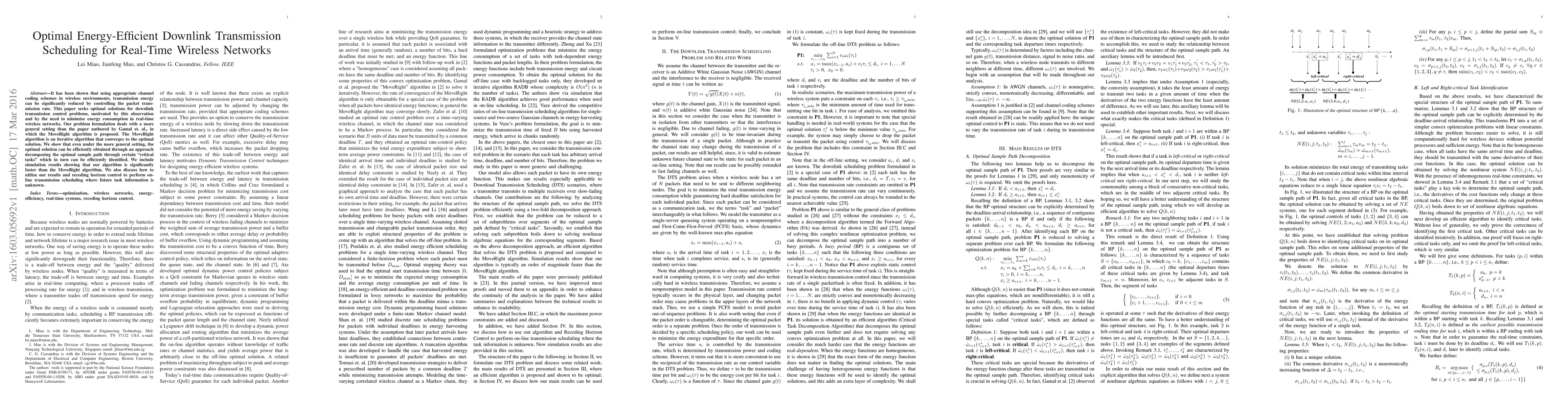 It has been shown that using appropriate channel coding schemes in wireless environments, transmission energy can be significantly reduced by controlling the packet transmission rate. This paper seeks optimal solutions for downlink transmission control problems, motivated by this observation and by the need to minimize energy consumption in real-time wireless networks. Our problem formulation deals with a more general setting than the paper authored by Gamal et. al., in which the MoveRight algorithm is proposed. The MoveRight algorithm is an iterative algorithm that converges to the optimal solution. We show that even under the more general setting, the optimal solution can be efficiently obtained through an approach decomposing the optimal sample path through certain "critical tasks" which in turn can be efficiently identified. We include simulation results showing that our algorithm is significantly faster than the MoveRight algorithm. We also discuss how to utilize our results and receding horizon control to perform on-line transmission scheduling where future task information is unknown.