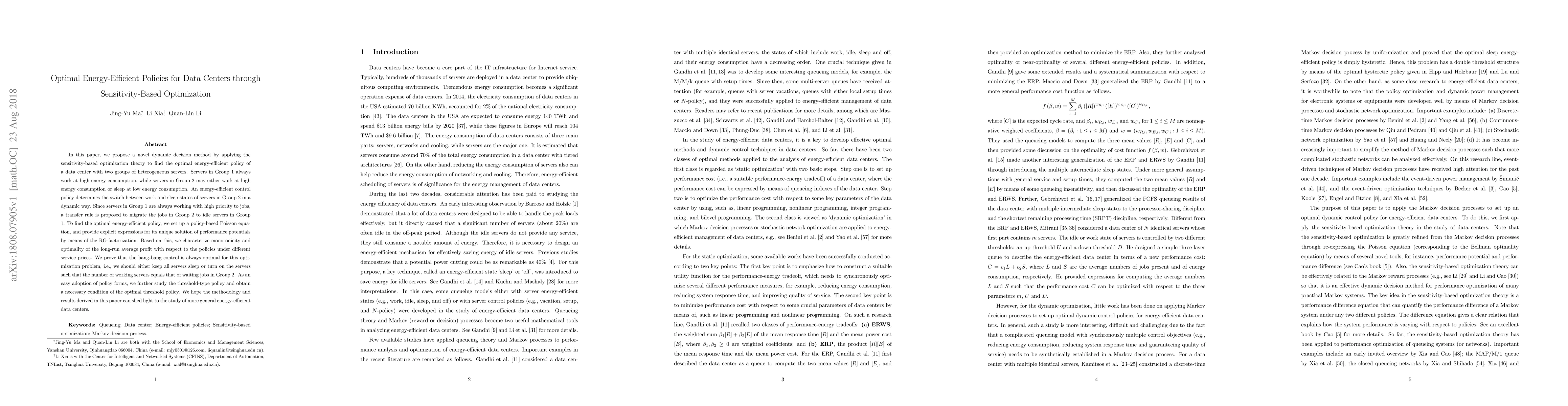 In this paper, we propose a novel dynamic decision method by applying the sensitivity-based optimization theory to find the optimal energy-efficient policy of a data center with two groups of heterogeneous servers. Servers in Group 1 always work at high energy consumption, while servers in Group 2 may either work at high energy consumption or sleep at low energy consumption. An energy-efficient control policy determines the switch between work and sleep states of servers in Group 2 in a dynamic way. Since servers in Group 1 are always working with high priority to jobs, a transfer rule is proposed to migrate the jobs in Group 2 to idle servers in Group 1. To find the optimal energy-efficient policy, we set up a policy-based Poisson equation, and provide explicit expressions for its unique solution of performance potentials by means of the RG-factorization. Based on this, we characterize monotonicity and optimality of the long-run average profit with respect to the policies under different service prices. We prove that the bang-bang control is always optimal for this optimization problem, i.e., we should either keep all servers sleep or turn on the servers such that the number of working servers equals that of waiting jobs in Group 2. As an easy adoption of policy forms, we further study the threshold-type policy and obtain a necessary condition of the optimal threshold policy. We hope the methodology and results derived in this paper can shed light to the study of more general energy-efficient data centers.