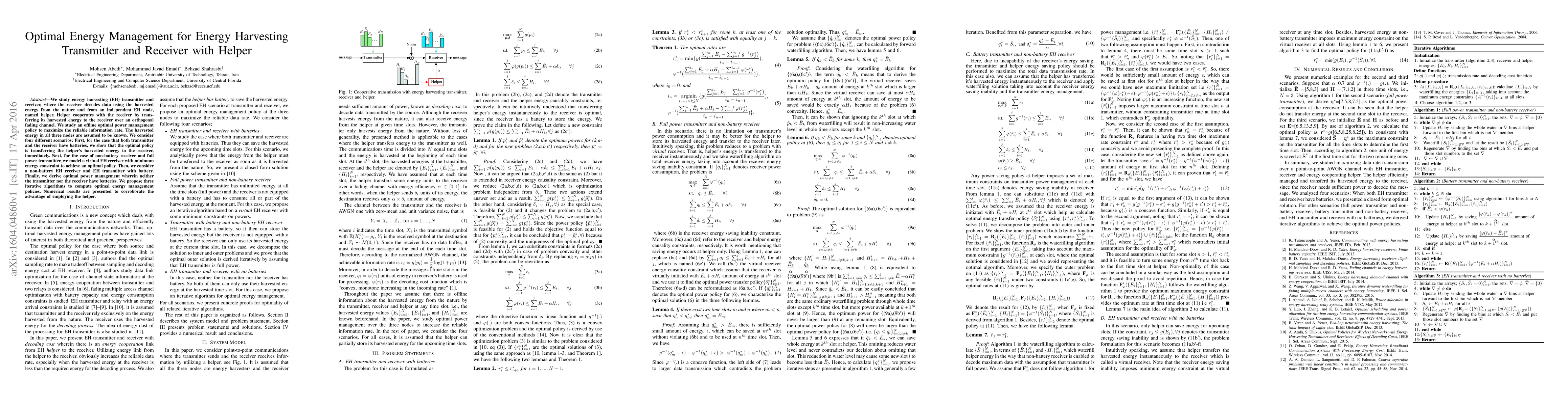This paper investigates optimal energy management strategies for energy harvesting transmitters and receivers, with a helper node that transfers harvested energy to the receiver. It proposes four scenarios and three iterative algorithms to maximize reliable information rate, demonstrating the benefits of using a helper node.