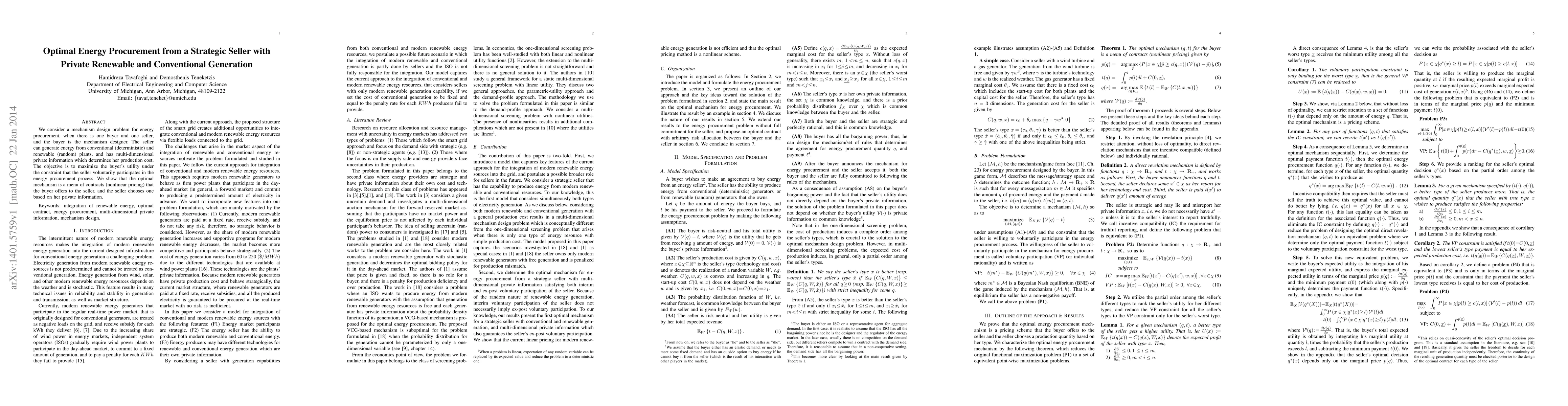 We consider a mechanism design problem for energy procurement, when there is one buyer and one seller, and the buyer is the mechanism designer. The seller can generate energy from conventional (deterministic) and renewable (random) plants, and has multi-dimensional private information which determines her production cost. The objective is to maximize the buyer's utility under the constraint that the seller voluntarily participates in the energy procurement process. We show that the optimal mechanism is a menu of contracts (nonlinear pricing) that the buyer offers to the seller, and the seller chooses one based on her private information.