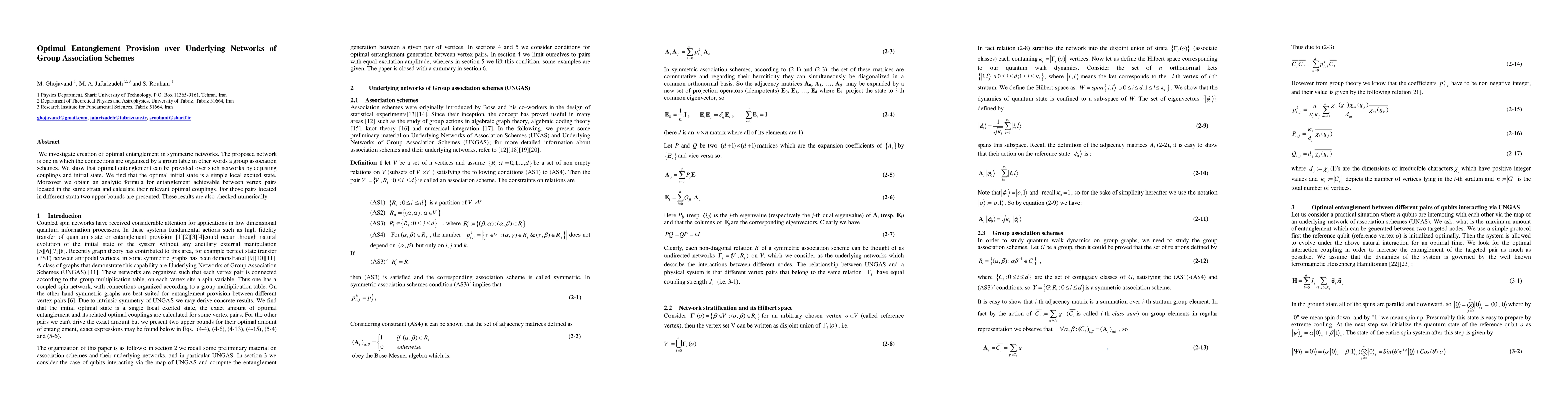 This paper explores the creation of optimal entanglement in symmetric networks structured by group association schemes, demonstrating that adjusting couplings and initial states can achieve this. The study finds that the optimal initial state is a local excited state, provides an analytic formula for entanglement within strata, and presents upper bounds for entanglement between different strata, with numerical verification.