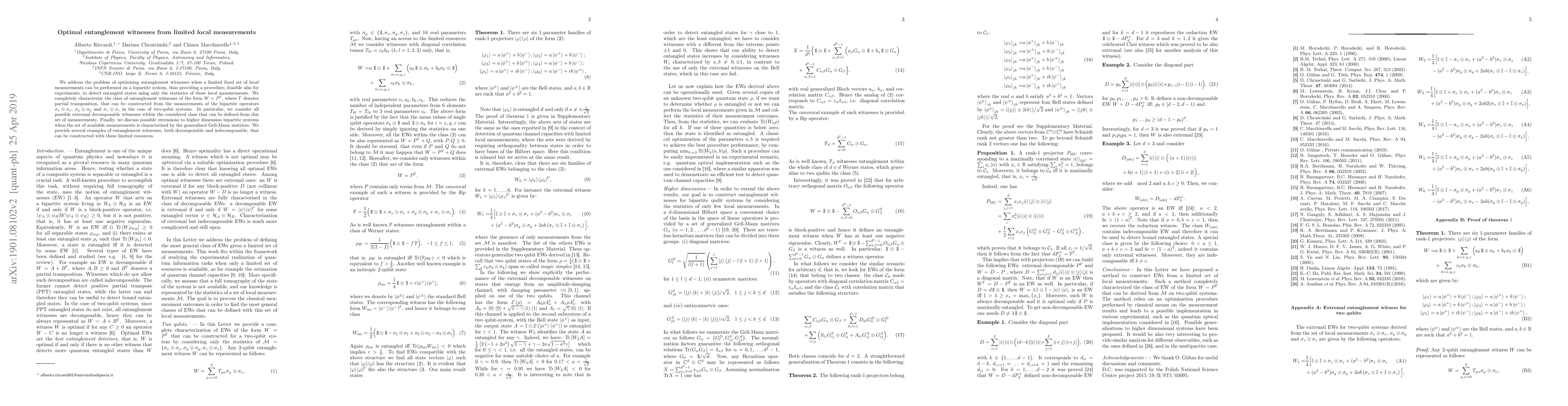 This paper develops a method to optimize entanglement witnesses for detecting entangled states in bipartite quantum systems using a limited set of local measurements. It characterizes optimal witnesses constructed from measurements of $\sigma_{x}\otimes\sigma_{x}$, $\sigma_{y}\otimes\sigma_{y}$, and $\sigma_{z}\otimes\sigma_{z}$ for two-qubit systems, and discusses extensions to higher dimensions using generalized Gell-Mann matrices.