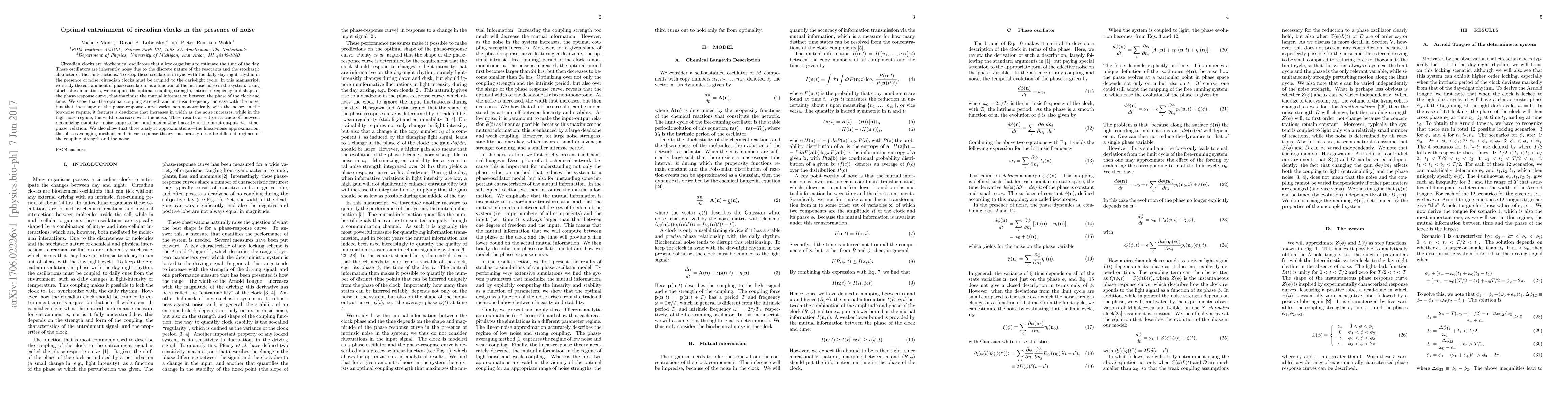 Circadian clocks are biochemical oscillators that allow organisms to estimate the time of the day. These oscillators are inherently noisy due to the discrete nature of the reactants and the stochastic character of their interactions. To keep these oscillators in sync with the daily day-night rhythm in the presence of noise, circadian clocks must be coupled to the dark-light cycle. In this manuscript, we study the entrainment of phase oscillators as a function of the intrinsic noise in the system. Using stochastic simulations, we compute the optimal coupling strength, intrinsic frequency and shape of the phase-response curve, that maximize the mutual information between the phase of the clock and time. We show that the optimal coupling strength and intrinsic frequency increase with the noise, but that the shape of the phase-response curve varies non-monotonically with the noise: in the low-noise regime, it features a deadzone that increases in width as the noise increases, while in the high-noise regime, the width decreases with the noise. These results arise from a trade-off between maximizing stability -noise suppression - and maximizing linearity of the input-output, i.e. time- phase, relation. We also show that three analytic approximations -the linear-noise approximation, the phase-averaging method, and linear-response theory- accurately describe different regimes of the coupling strength and the noise.