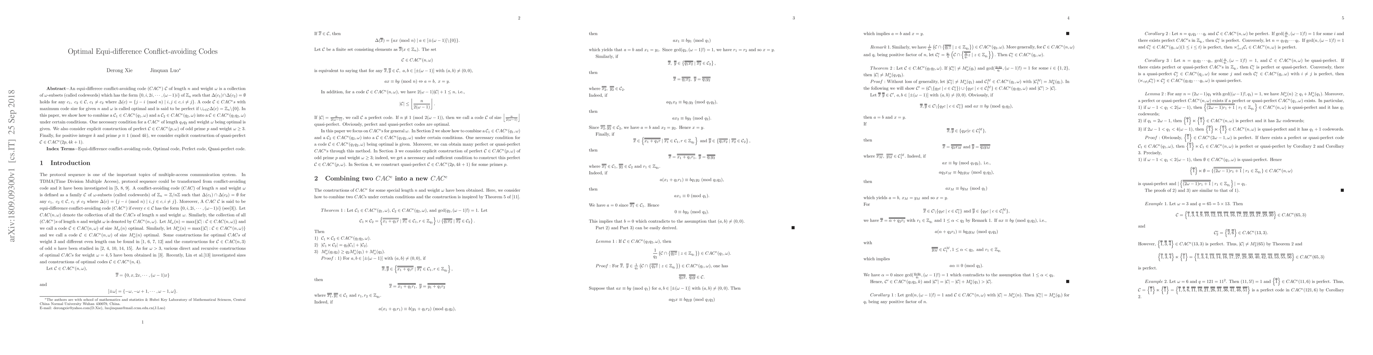 Researchers develop a method to combine two conflict-avoiding codes into an optimal code, with implications for building perfect and quasi-perfect error-correcting codes of specific lengths and weights.