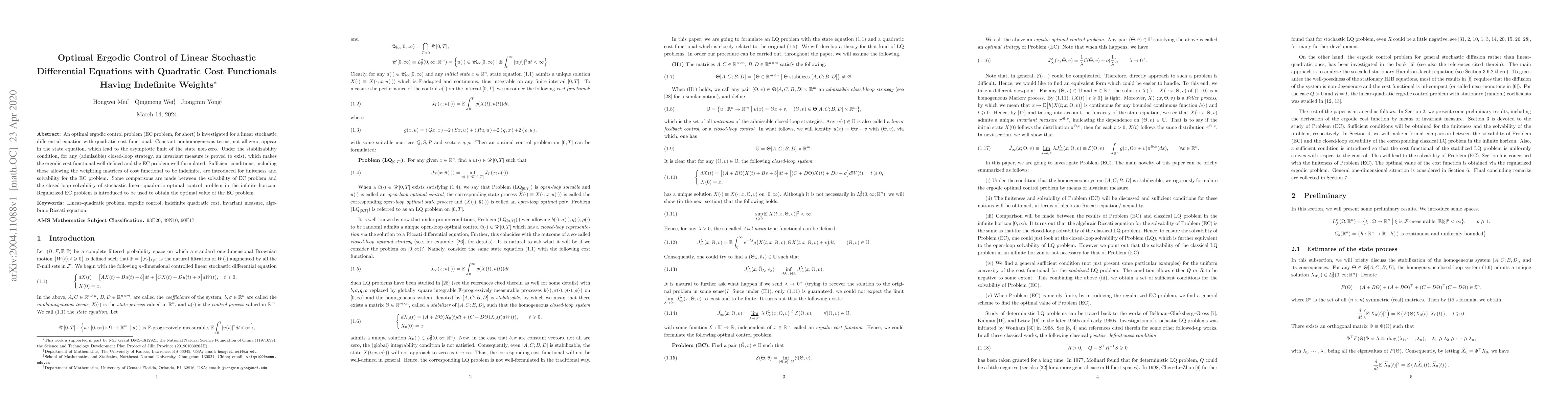 This paper investigates an optimal ergodic control problem for linear stochastic differential equations with quadratic cost functionals, allowing indefinite weights. It proves the existence of an invariant measure under stabilizability conditions, ensuring the well-formulation of the problem and provides sufficient conditions for its finiteness and solvability.