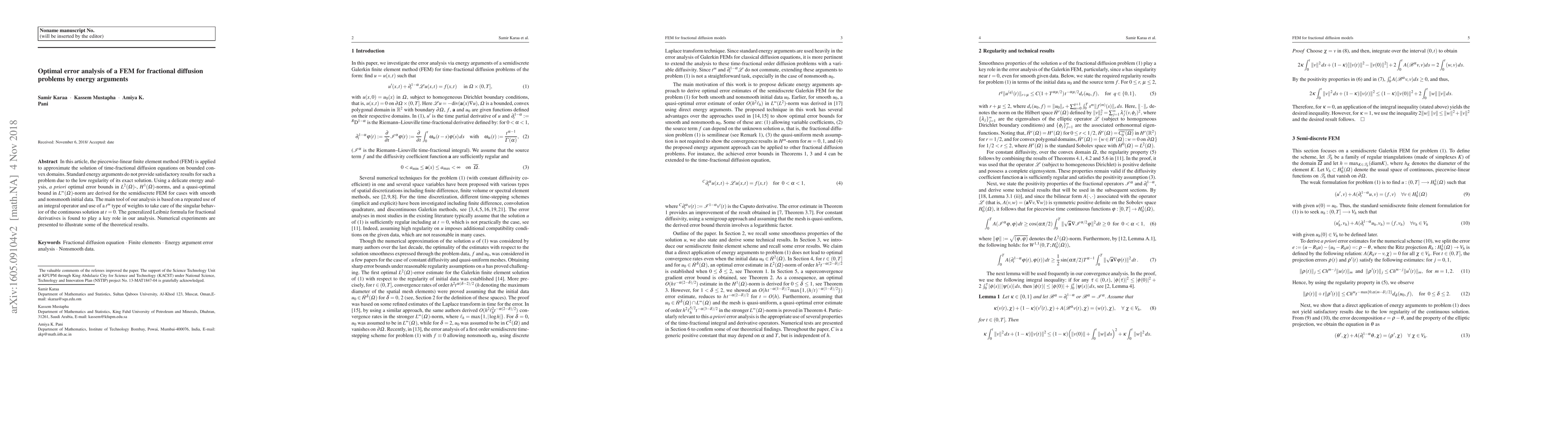 This paper applies a piecewise-linear finite element method to approximate solutions of time-fractional diffusion equations, deriving optimal error bounds using a refined energy analysis and integral operators. Numerical experiments validate the theoretical results.