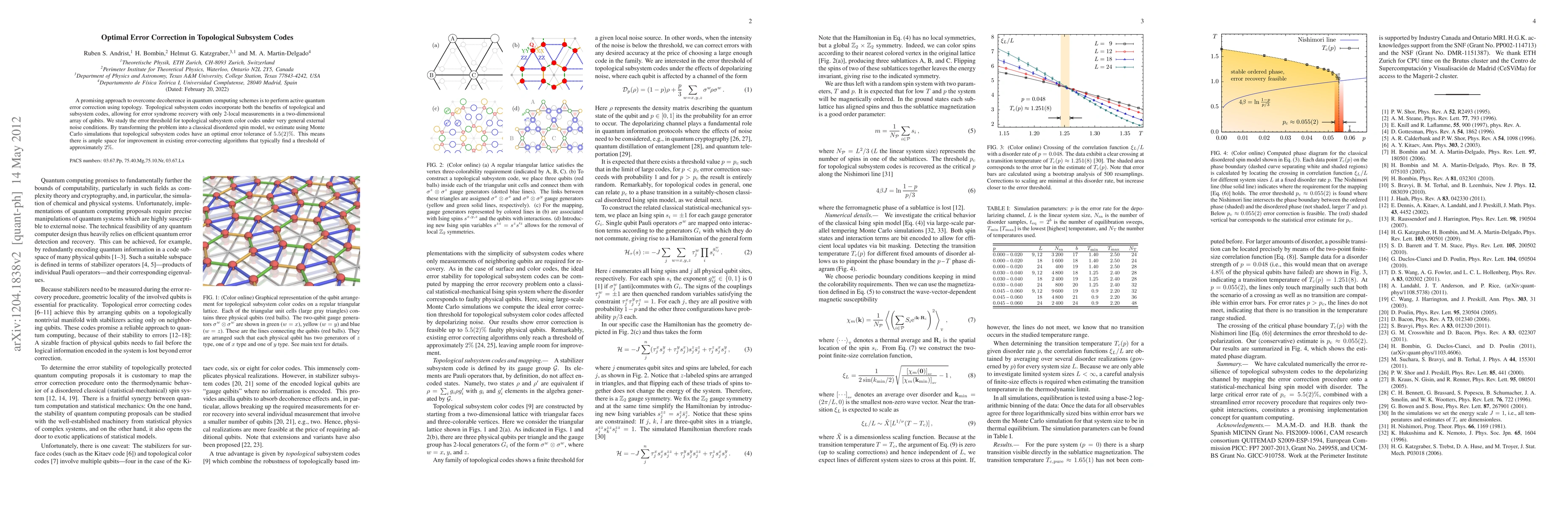 Title: Optimal error correction in topological subsystem codes Summary: The paper investigates the error threshold for topological subsystem color codes under various noise conditions, finding an optimal error tolerance of 5.5(2)% through Monte Carlo simulations, significantly higher than the typical 2% threshold in existing algorithms.