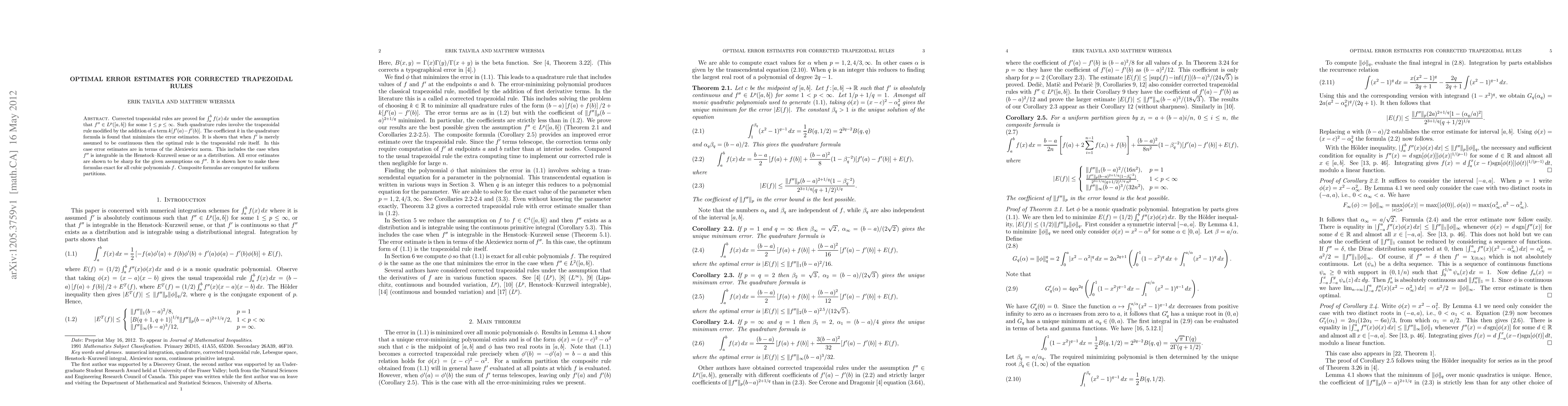 Corrected trapezoidal rules are proved for $\int_a^b f(x)\,dx$ under the assumption that $f"\in L^p([a,b])$ for some $1\leq p\leq\infty$. Such quadrature rules involve the trapezoidal rule modified by the addition of a term $k[f'(a)-f'(b)]$. The coefficient $k$ in the quadrature formula is found that minimizes the error estimates. It is shown that when $f'$ is merely assumed to be continuous then the optimal rule is the trapezoidal rule itself. In this case error estimates are in terms of the Alexiewicz norm. This includes the case when $f"$ is integrable in the Henstock--Kurzweil sense or as a distribution. All error estimates are shown to be sharp for the given assumptions on $f"$. It is shown how to make these formulas exact for all cubic polynomials $f$. Composite formulas are computed for uniform partitions.