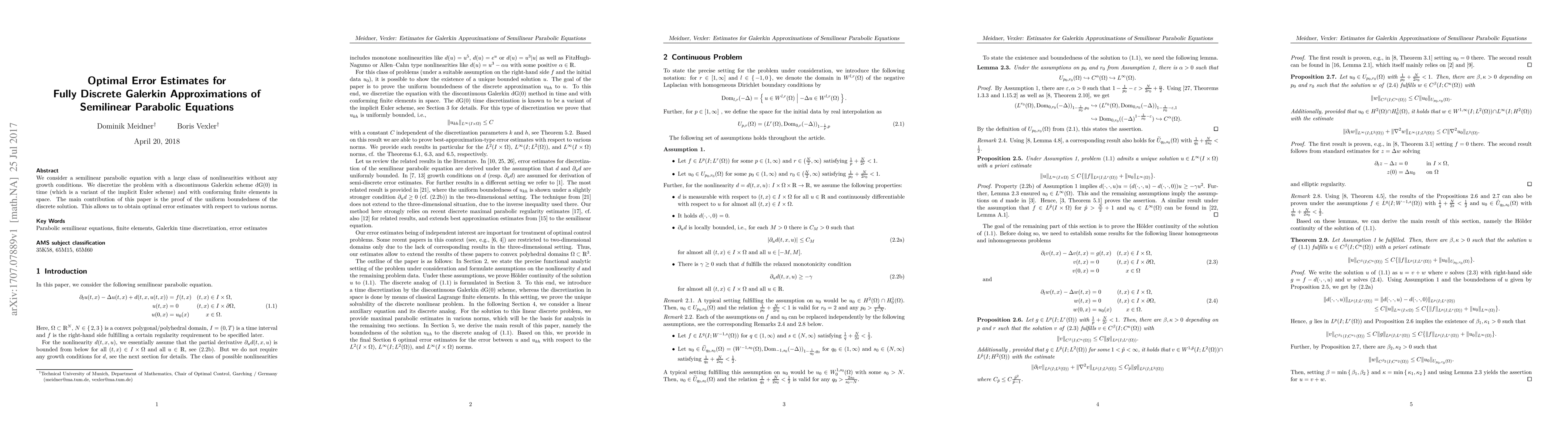 This paper investigates semilinear parabolic equations with broad nonlinearities, employing a dG(0) time discretization and conforming finite elements in space. The key result is the proof of uniform boundedness of the discrete solution, leading to optimal error estimates across various norms.