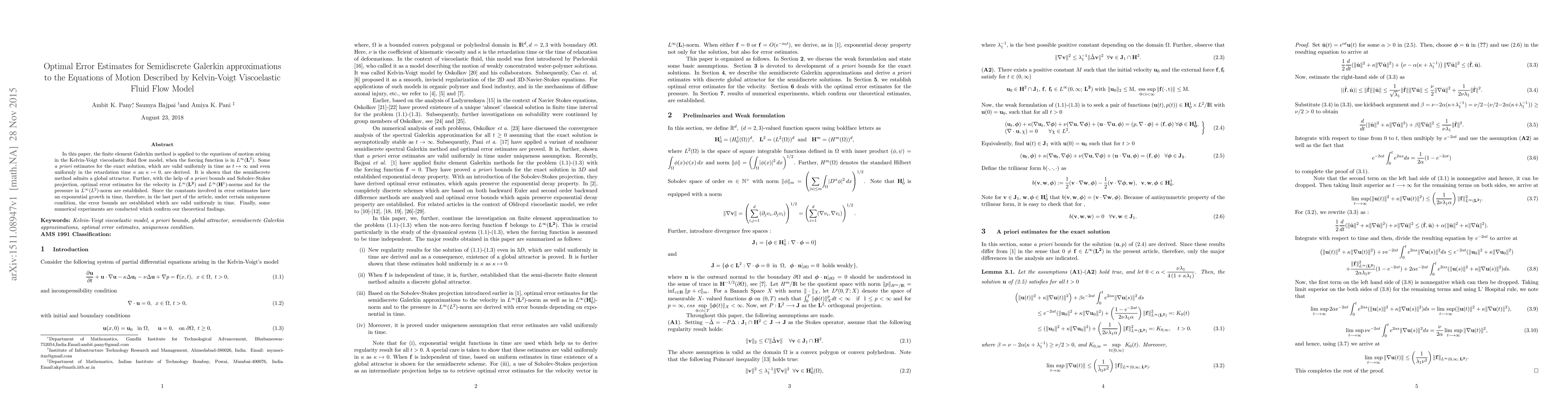 This paper investigates the finite element Galerkin method for the Kelvin-Voigt model of viscoelastic fluid flow, deriving optimal error estimates and proving the existence of a global attractor. Numerical experiments validate the theoretical results.