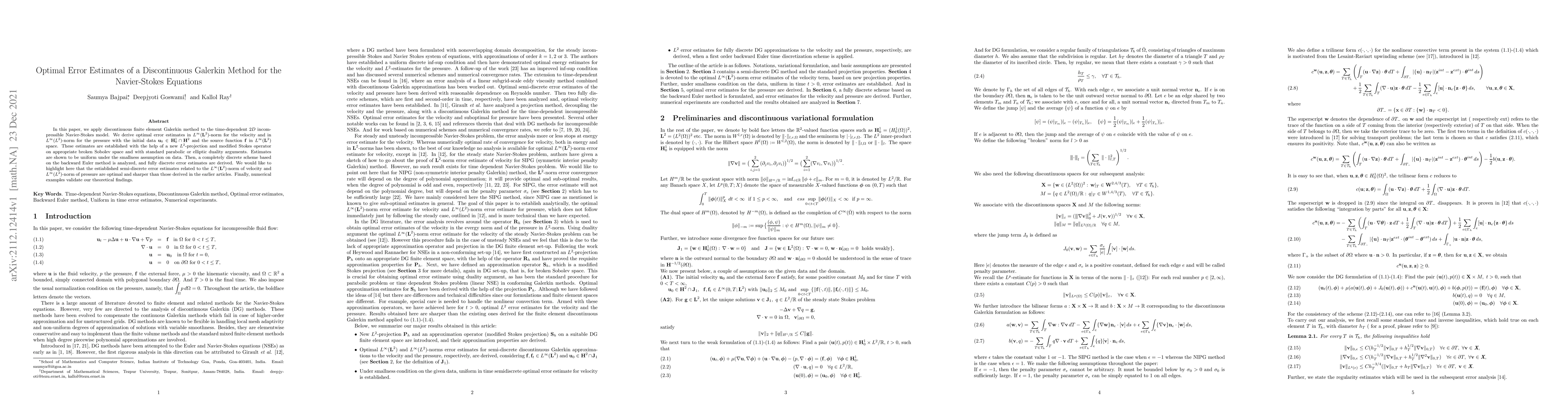 This paper develops optimal error estimates for a discontinuous Galerkin method applied to the 2D incompressible Navier-Stokes equations, showing sharper estimates than previous works and validating the results with numerical examples. The estimates are uniform under smallness assumptions on initial data and source functions.