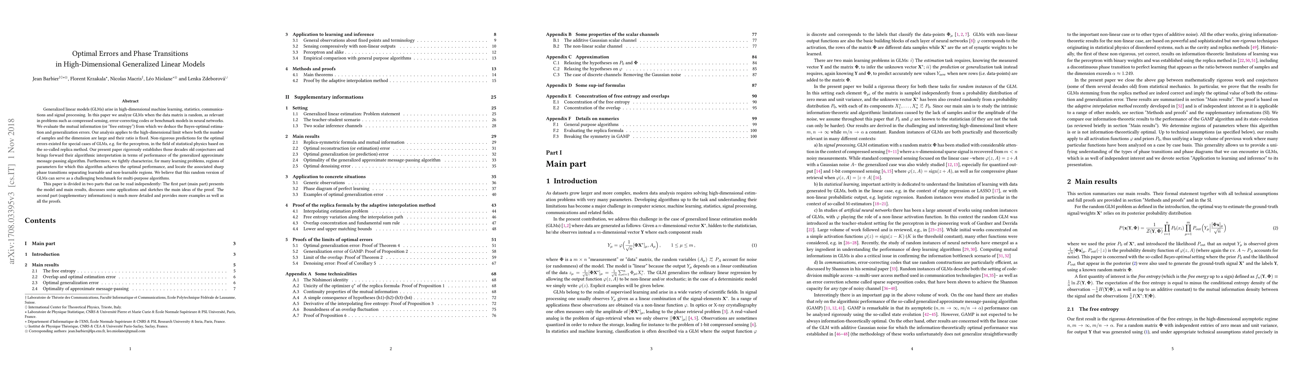 This paper rigorously analyzes generalized linear models (GLMs) under random data conditions, establishing optimal estimation and generalization errors in the high-dimensional limit. It characterizes phase transitions between learnable and non-learnable regions, providing a benchmark for multi-purpose algorithms and detailed proofs in a supplementary section.