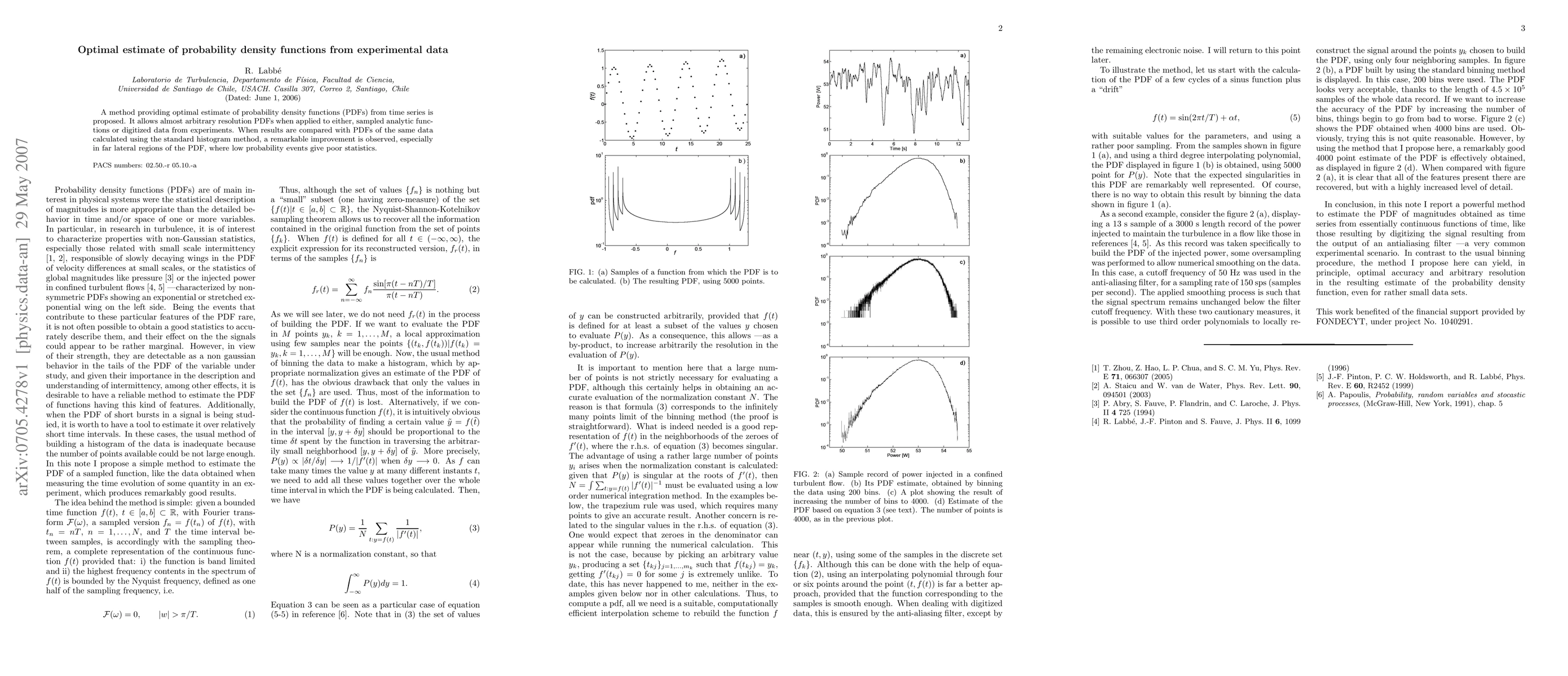 A method providing optimal estimate of probability density functions (PDFs) from time series is proposed. It allows almost arbitrary resolution PDFs when applied to either, sampled analytic functions or digitized data from experiments. When results are compared with PDFs of the same data calculated using the standard histogram method, a remarkable improvement is observed, especially in far lateral regions of the PDF, where low probability events give poor statistics.