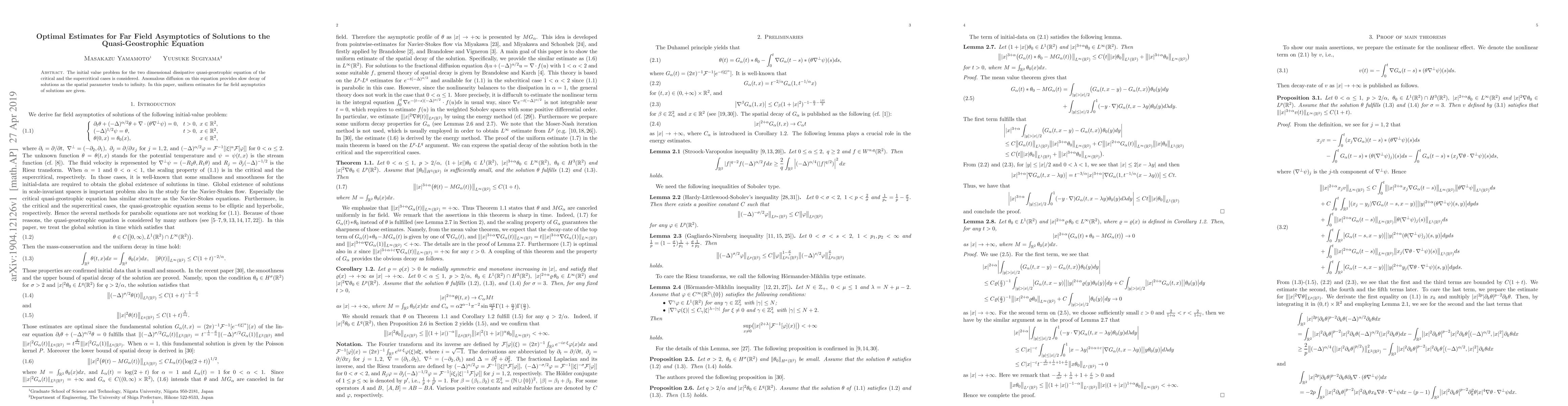 This paper provides uniform estimates for the far field asymptotics of solutions to the two-dimensional dissipative quasi-geostrophic equation, addressing both critical and supercritical cases, and analyzes the phenomenon of anomalous diffusion leading to slow decay of solutions.