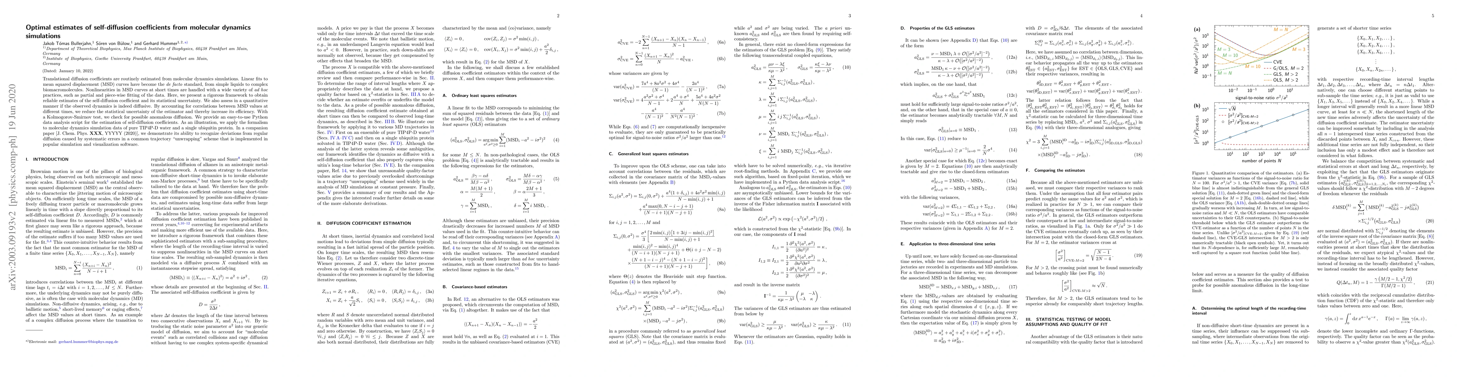 This paper presents a rigorous framework for estimating diffusion coefficients from molecular dynamics simulations, reducing statistical uncertainty through time-correlation accounting and employing a Kolmogorov-Smirnov test to detect anomalous diffusion. It provides a Python script for practical application and demonstrates its effectiveness on TIP4P-D water and ubiquitin protein simulations.