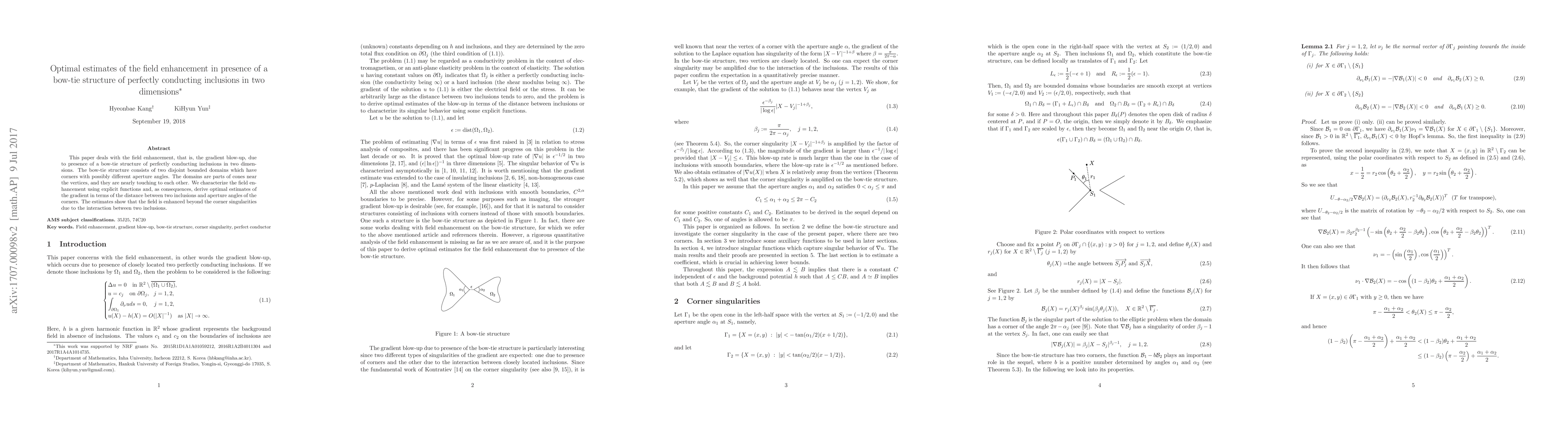 Researchers studied how electromagnetic fields interact with perfectly conducting inclusions in two dimensions, revealing that a bow-tie structure enhances the field beyond its natural corner singularities due to interaction between two inclusions.