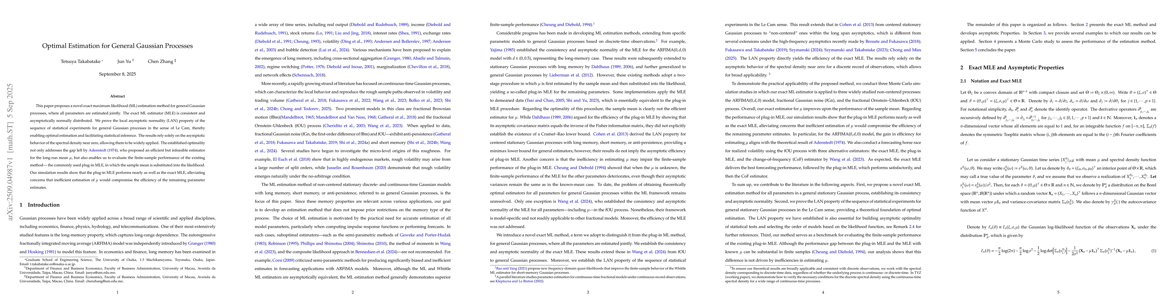 This paper proposes a novel exact maximum likelihood (ML) estimation method for general Gaussian processes, where all parameters are estimated jointly. The exact ML estimator (MLE) is consistent and asymptotically normally distributed. We prove the local asymptotic normality (LAN) property of the sequence of statistical experiments for general Gaussian processes in the sense of Le Cam, thereby enabling optimal estimation and facilitating statistical inference. The results rely solely on the asymptotic behavior of the spectral density near zero, allowing them to be widely applied. The established optimality not only addresses the gap left by Adenstedt(1974), who proposed an efficient but infeasible estimator for the long-run mean $\mu$, but also enables us to evaluate the finite-sample performance of the existing method -- the commonly used plug-in MLE, in which the sample mean is substituted into the likelihood. Our simulation results show that the plug-in MLE performs nearly as well as the exact MLE, alleviating concerns that inefficient estimation of $\mu$ would compromise the efficiency of the remaining parameter estimates.