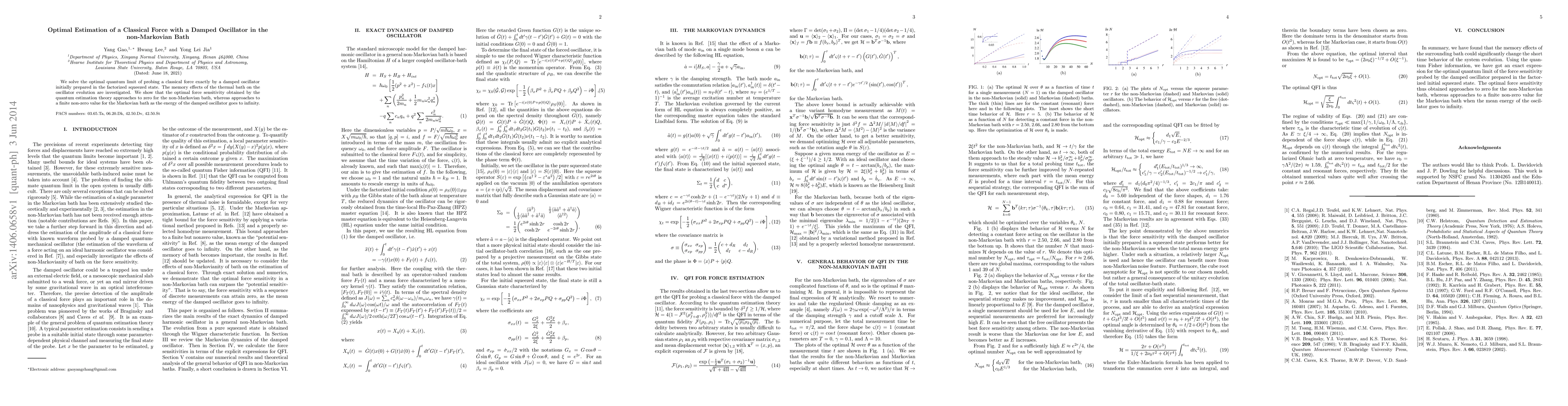 This paper investigates optimal quantum estimation of a classical force using a damped oscillator in a non-Markovian thermal bath, showing that force sensitivity approaches zero in non-Markovian conditions but remains finite in Markovian conditions as oscillator energy increases.