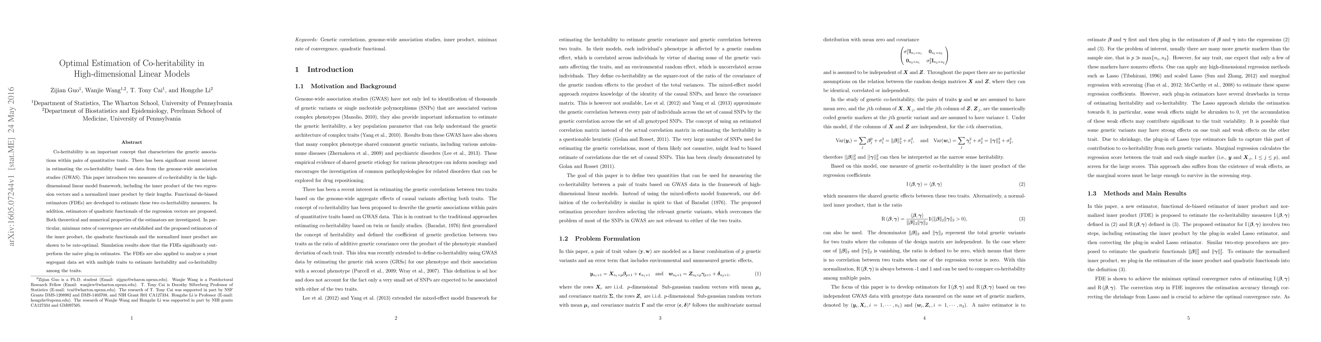 This paper introduces new measures and estimators for co-heritability in high-dimensional linear models, developing functional de-biased estimators that outperform naive methods, and demonstrating optimal convergence rates through theoretical and empirical analysis.