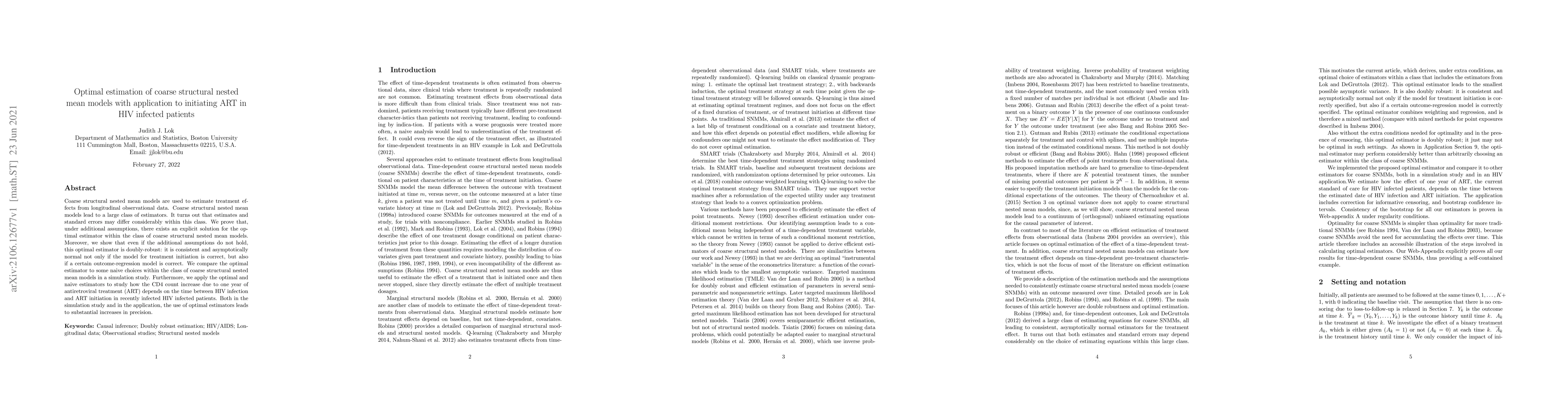 Coarse structural nested mean models are used to estimate treatment effects from longitudinal observational data. Coarse structural nested mean models lead to a large class of estimators. It turns out that estimates and standard errors may differ considerably within this class. We prove that, under additional assumptions, there exists an explicit solution for the optimal estimator within the class of coarse structural nested mean models. Moreover, we show that even if the additional assumptions do not hold, this optimal estimator is doubly-robust: it is consistent and asymptotically normal not only if the model for treatment initiation is correct, but also if a certain outcome-regression model is correct. We compare the optimal estimator to some naive choices within the class of coarse structural nested mean models in a simulation study. Furthermore, we apply the optimal and naive estimators to study how the CD4 count increase due to one year of antiretroviral treatment (ART) depends on the time between HIV infection and ART initiation in recently infected HIV infected patients. Both in the simulation study and in the application, the use of optimal estimators leads to substantial increases in precision.