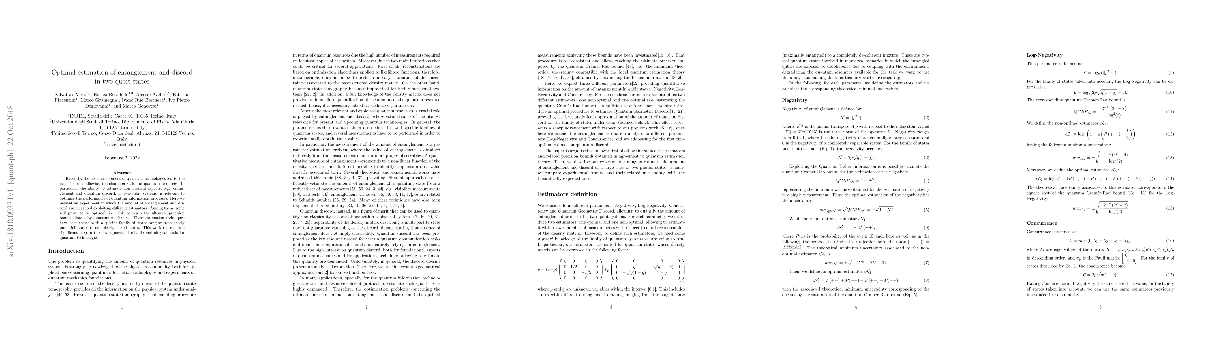 This paper explores the optimal estimation of entanglement and discord in two-qubit states, presenting experimental techniques that achieve the ultimate precision bound allowed by quantum mechanics. The study tests these estimators across a range of states from nearly pure to completely mixed, contributing to the development of reliable metrological tools for quantum technologies.