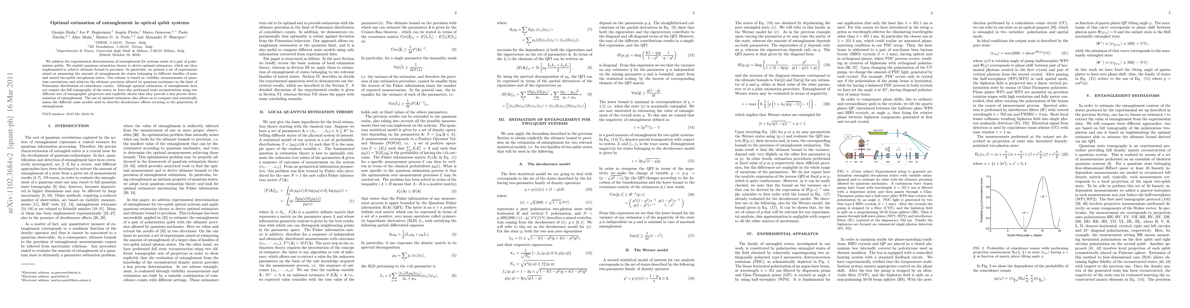 This paper develops optimal estimators for determining entanglement in optical qubit systems, achieving the ultimate precision limit allowed by quantum mechanics. It compares these estimators to traditional tomography methods and assesses various noise models for decoherence effects.