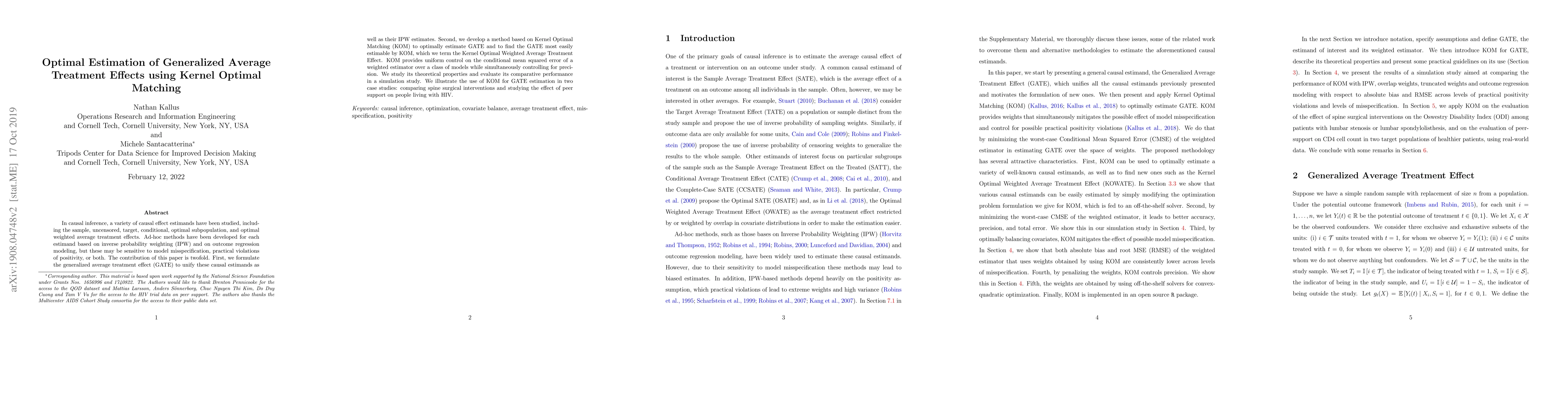This paper unifies various causal effect estimands under the generalized average treatment effect (GATE) and introduces Kernel Optimal Matching (KOM) to estimate GATE, offering a robust method that controls for model misspecification and precision. The KOM method is evaluated through simulations and applied in two case studies on spine surgery and peer support for HIV patients.