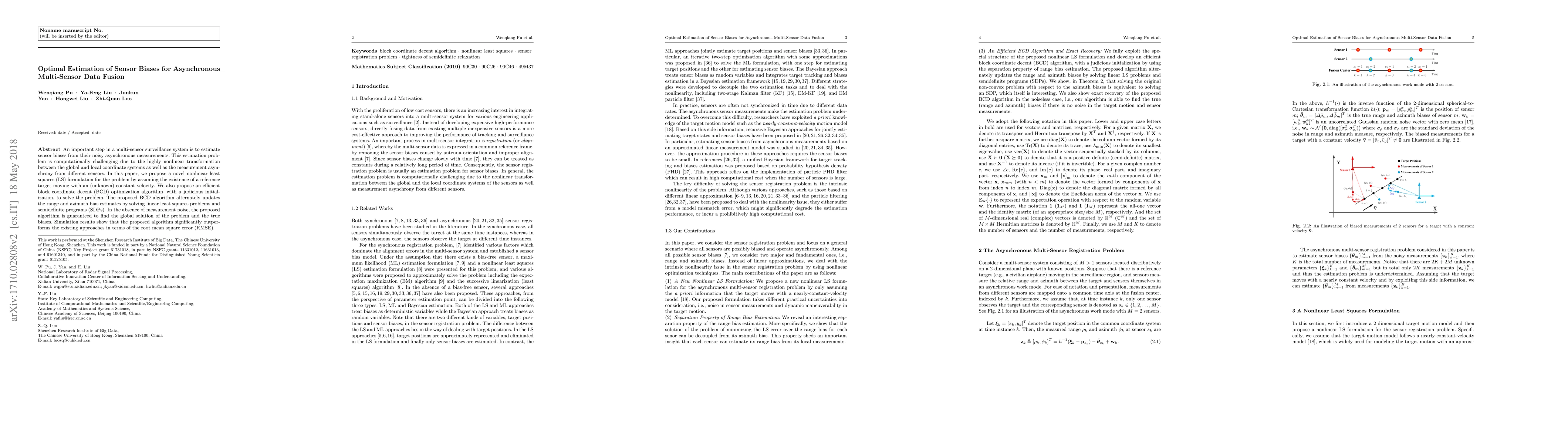 An important step in a multi-sensor surveillance system is to estimate sensor biases from their noisy asynchronous measurements. This estimation problem is computationally challenging due to the highly nonlinear transformation between the global and local coordinate systems as well as the measurement asynchrony from different sensors. In this paper, we propose a novel nonlinear least squares (LS) formulation for the problem by assuming the existence of a reference target moving with an (unknown) constant velocity. We also propose an efficient block coordinate decent (BCD) optimization algorithm, with a judicious initialization, to solve the problem. The proposed BCD algorithm alternately updates the range and azimuth bias estimates by solving linear least squares problems and semidefinite programs (SDPs). In the absence of measurement noise, the proposed algorithm is guaranteed to find the global solution of the problem and the true biases. Simulation results show that the proposed algorithm significantly outperforms the existing approaches in terms of the root mean square error (RMSE).