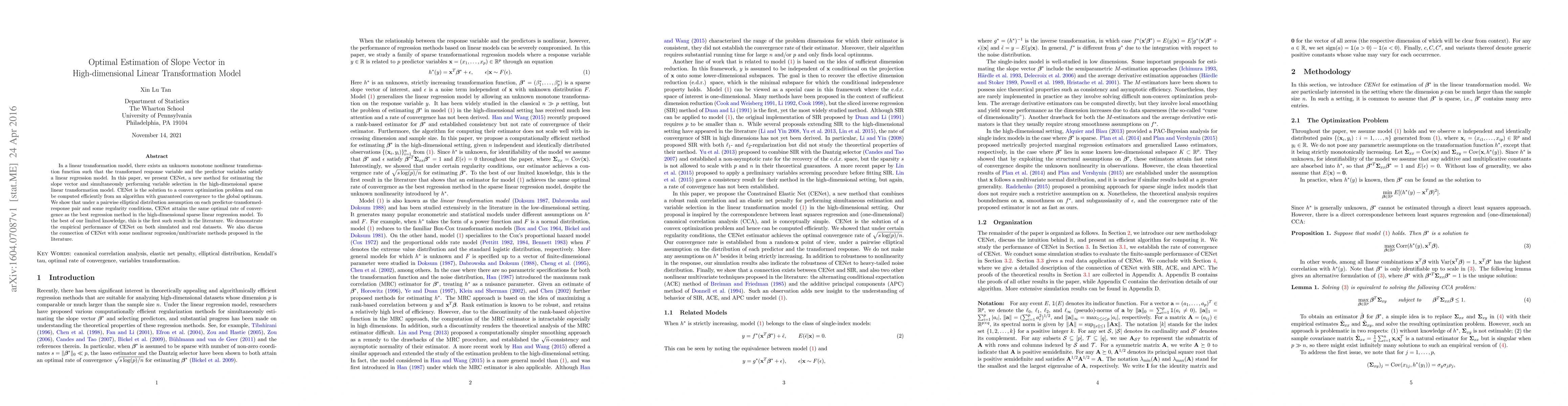 In a linear transformation model, there exists an unknown monotone nonlinear transformation function such that the transformed response variable and the predictor variables satisfy a linear regression model. In this paper, we present CENet, a new method for estimating the slope vector and simultaneously performing variable selection in the high-dimensional sparse linear transformation model. CENet is the solution to a convex optimization problem and can be computed efficiently from an algorithm with guaranteed convergence to the global optimum. We show that under a pairwise elliptical distribution assumption on each predictor-transformed-response pair and some regularity conditions, CENet attains the same optimal rate of convergence as the best regression method in the high-dimensional sparse linear regression model. To the best of our limited knowledge, this is the first such result in the literature. We demonstrate the empirical performance of CENet on both simulated and real datasets. We also discuss the connection of CENet with some nonlinear regression/multivariate methods proposed in the literature.