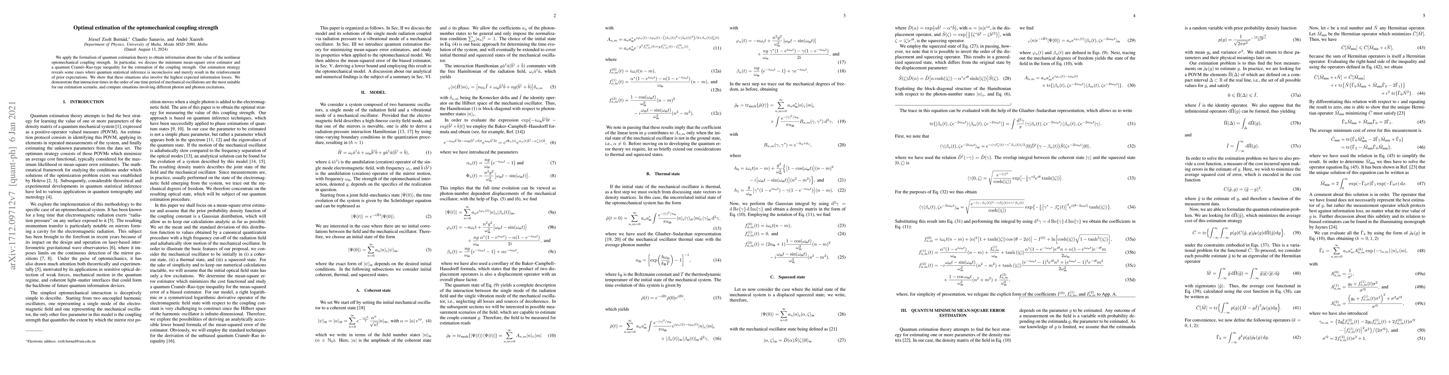 This paper utilizes quantum estimation theory to determine the optimal method for estimating the optomechanical coupling strength, revealing scenarios where quantum inference is inconclusive and highlighting the highest information losses. It finds that interaction times around one mechanical oscillation period yield the best results, comparing various photon and phonon excitations.