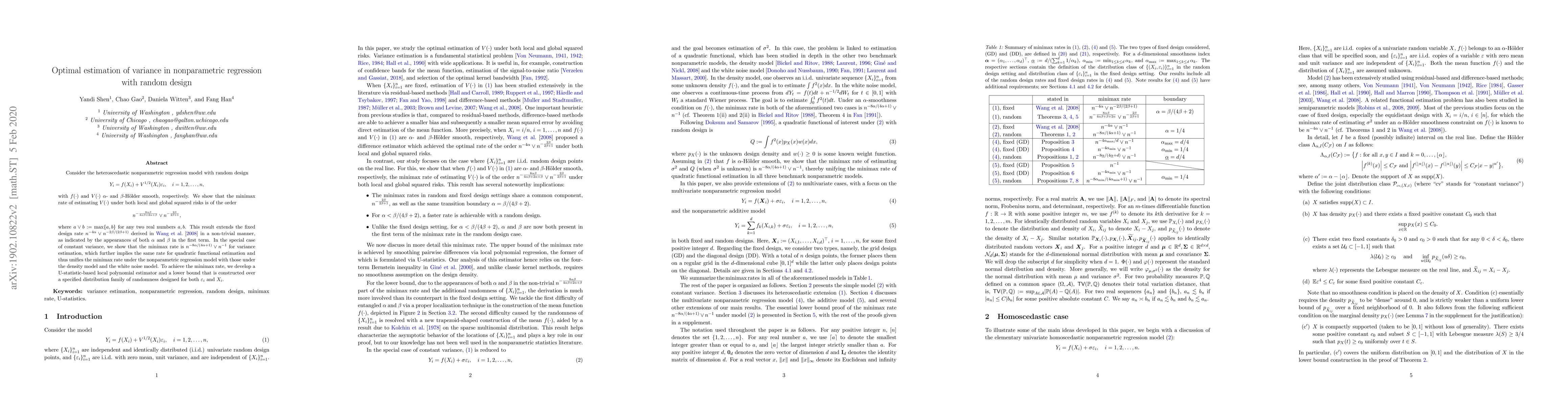 This paper investigates the optimal estimation of variance in a heteroscedastic nonparametric regression model with random design. The authors derive the minimax rate for estimating the variance function, extending previous results from fixed design scenarios and unifying rates across different models.