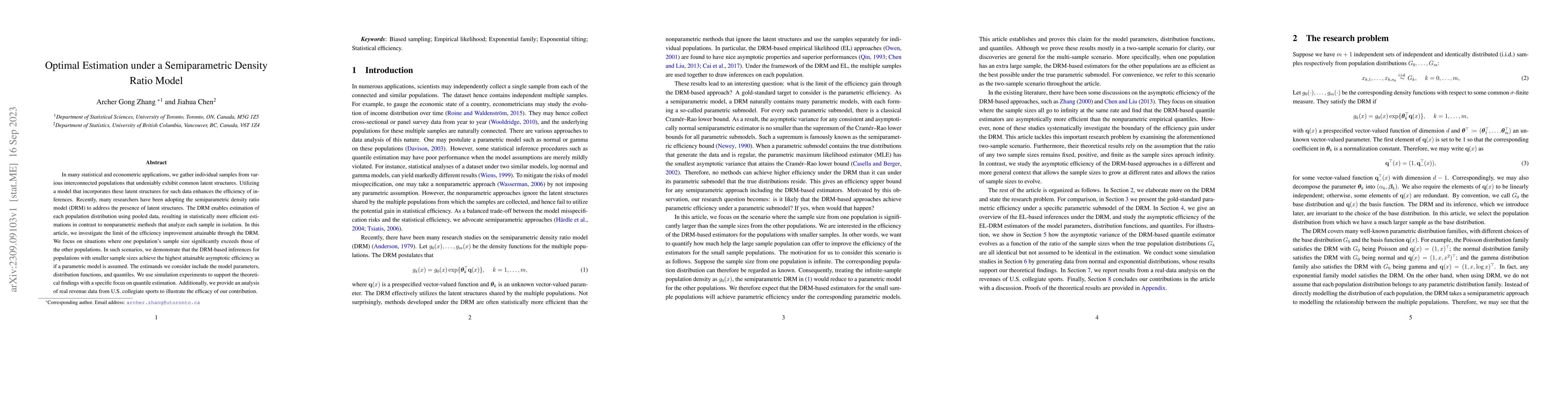 This paper explores the efficiency of semiparametric density ratio models (DRM) in estimating population distributions when samples from interconnected populations share latent structures. It demonstrates that the DRM achieves optimal efficiency for populations with smaller sample sizes, even in the presence of larger samples, and validates these findings through simulations and an analysis of U.S. collegiate sports revenue data.