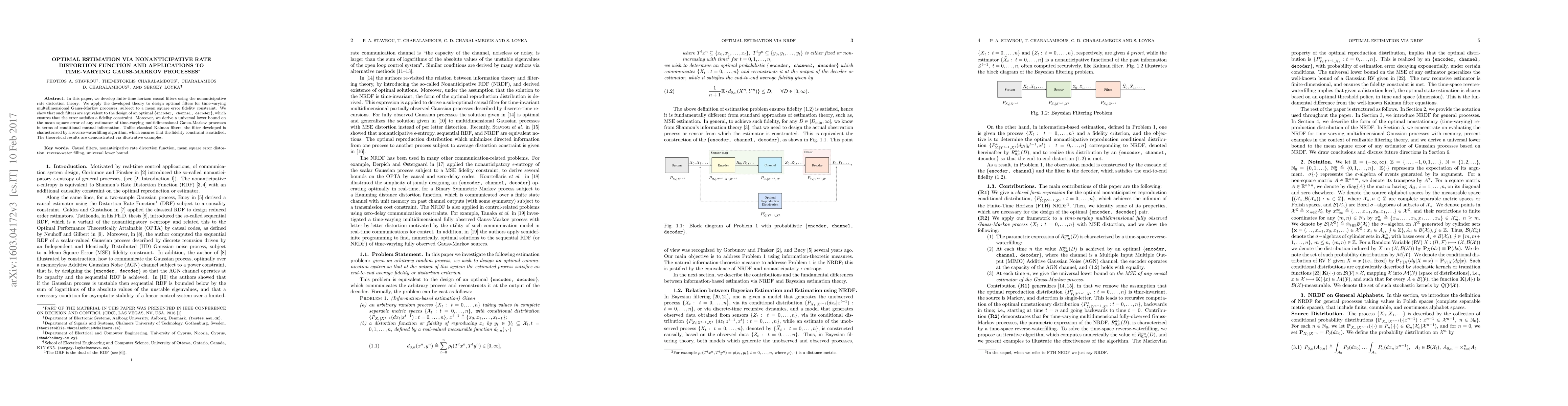 This paper develops causal filters using nonanticipative rate distortion theory for time-varying Gauss-Markov processes, showing they are equivalent to optimal encoder-channel-decoder design. It introduces a reverse-waterfilling algorithm to meet fidelity constraints, providing a universal lower bound on mean square error.