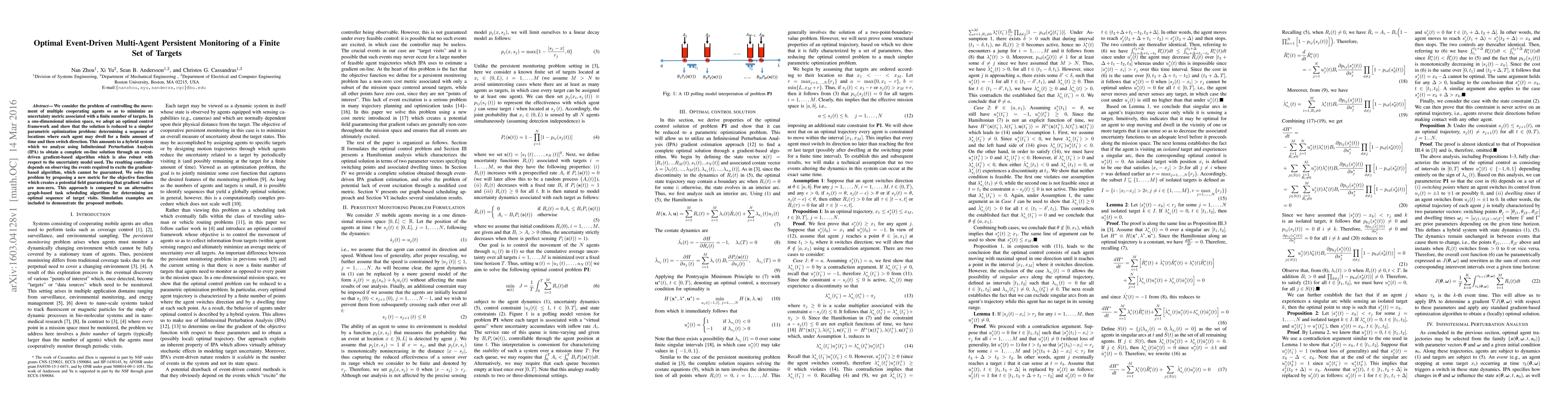 We consider the problem of controlling the movement of multiple cooperating agents so as to minimize an uncertainty metric associated with a finite number of targets. In a one-dimensional mission space, we adopt an optimal control framework and show that the solution is reduced to a simpler parametric optimization problem: determining a sequence of locations where each agent may dwell for a finite amount of time and then switch direction. This amounts to a hybrid system which we analyze using Infinitesimal Perturbation Analysis (IPA) to obtain a complete on-line solution through an event-driven gradient-based algorithm which is also robust with respect to the uncertainty model used. The resulting controller depends on observing the events required to excite the gradient-based algorithm, which cannot be guaranteed. We solve this problem by proposing a new metric for the objective function which creates a potential field guaranteeing that gradient values are non-zero. This approach is compared to an alternative graph-based task scheduling algorithm for determining an optimal sequence of target visits. Simulation examples are included to demonstrate the proposed methods.