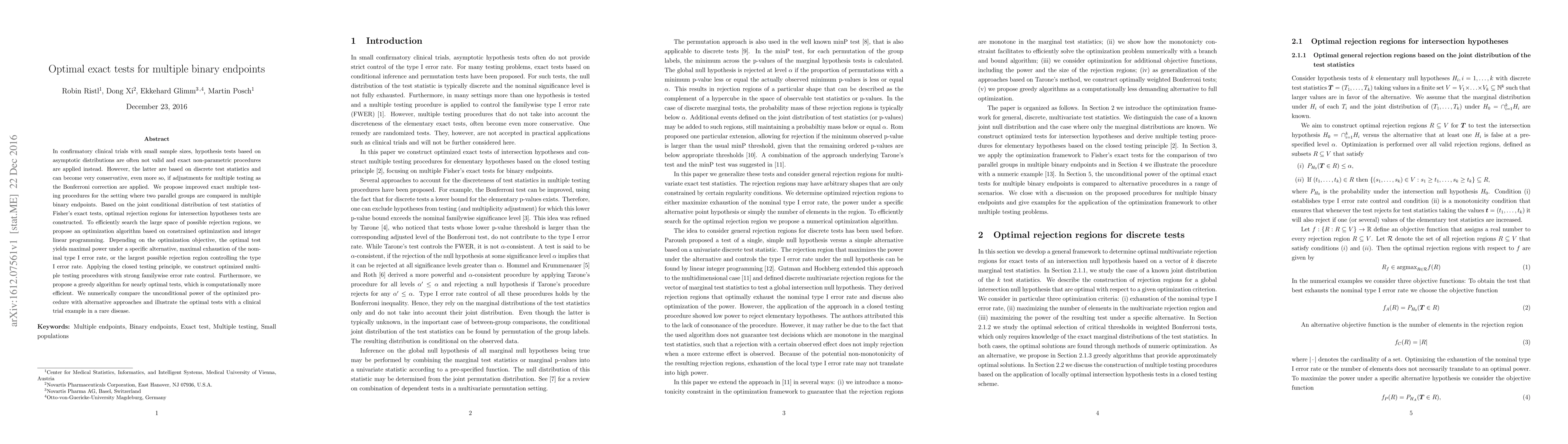 This paper proposes improved exact multiple testing procedures for comparing two groups across multiple binary endpoints in small sample clinical trials, using optimization algorithms to construct optimal rejection regions. The methods aim to maximize power, control type I error rates, or achieve the largest rejection regions, with a comparison to alternative approaches and an application to a rare disease trial.