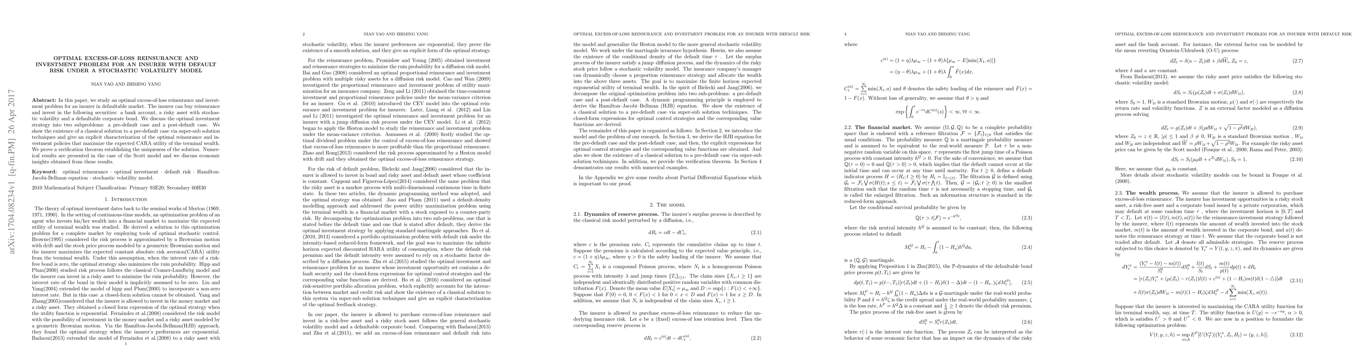 This paper explores the optimal excess-of-loss reinsurance and investment strategy for an insurer in a defaultable market, considering securities with stochastic volatility. It provides a classical solution for pre-default conditions and characterizes the optimal policies maximizing expected utility, supported by a verification theorem and numerical results from the Scott model.