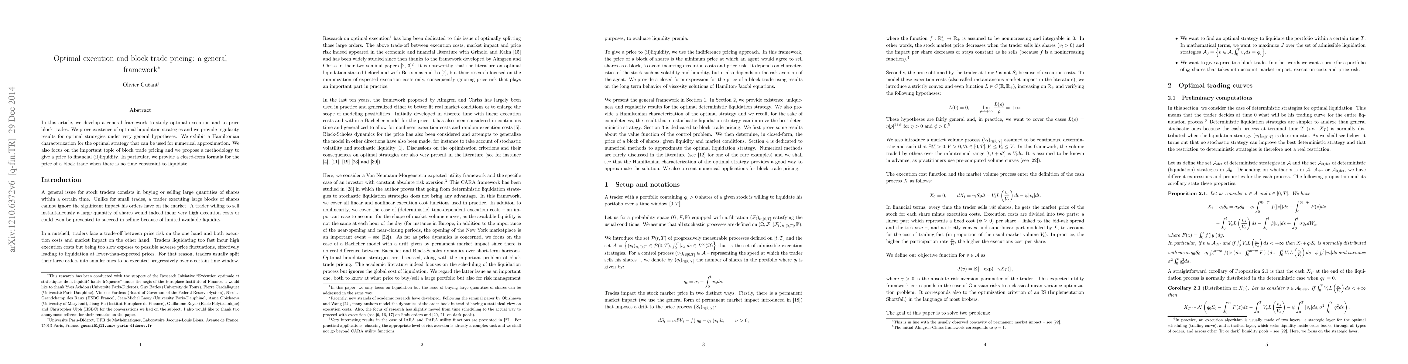This paper develops a general framework to study optimal execution and block trade pricing, proving existence of optimal strategies and providing methods for numerical approximation and financial liquidity pricing.