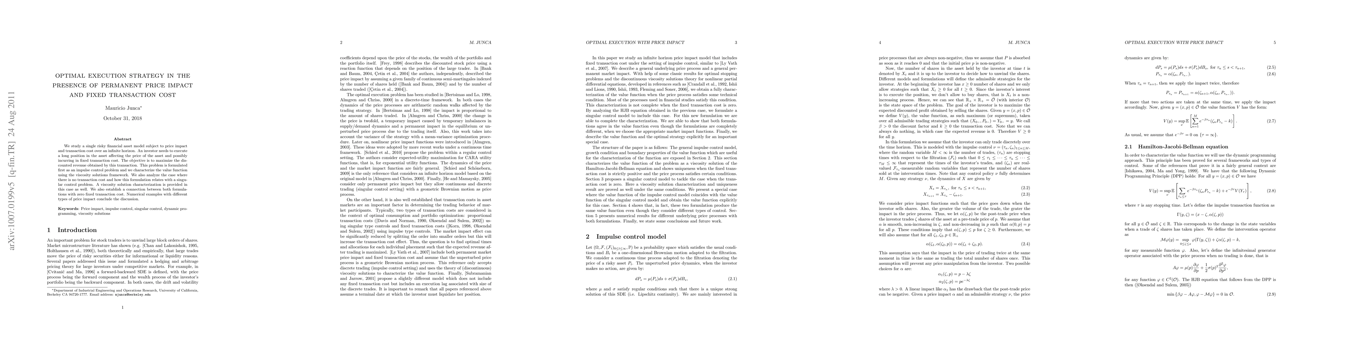 This paper investigates optimal execution strategies for trading a risky financial asset under permanent price impact and fixed transaction costs over an infinite horizon. The authors formulate the problem as an impulse control problem and utilize the viscosity solutions framework to characterize the value function, providing numerical examples to illustrate different types of price impact.
