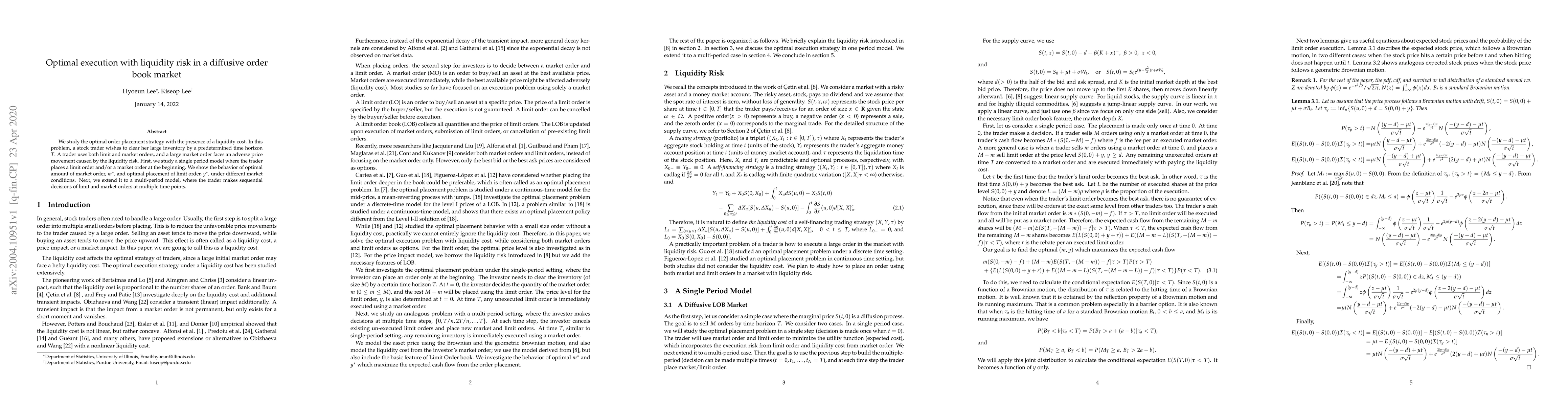 This paper investigates optimal trading strategies in a diffusive order book market, focusing on the execution of large orders amidst liquidity risk. It first analyzes a single-period model to determine the optimal mix of market and limit orders, then extends the analysis to a multi-period framework with sequential order placements.