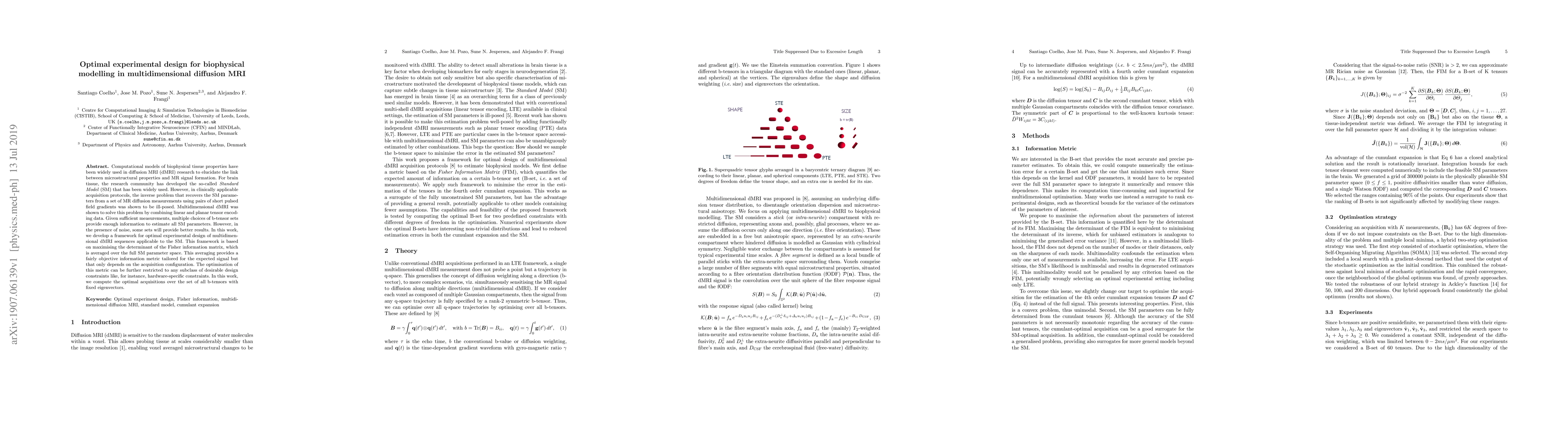 This paper develops a framework for optimal experimental design in multidimensional diffusion MRI to better estimate biophysical tissue properties, focusing on maximising the determinant of the Fisher information matrix. The approach aims to provide robust parameter recovery despite noise, with flexibility to incorporate hardware-specific constraints.