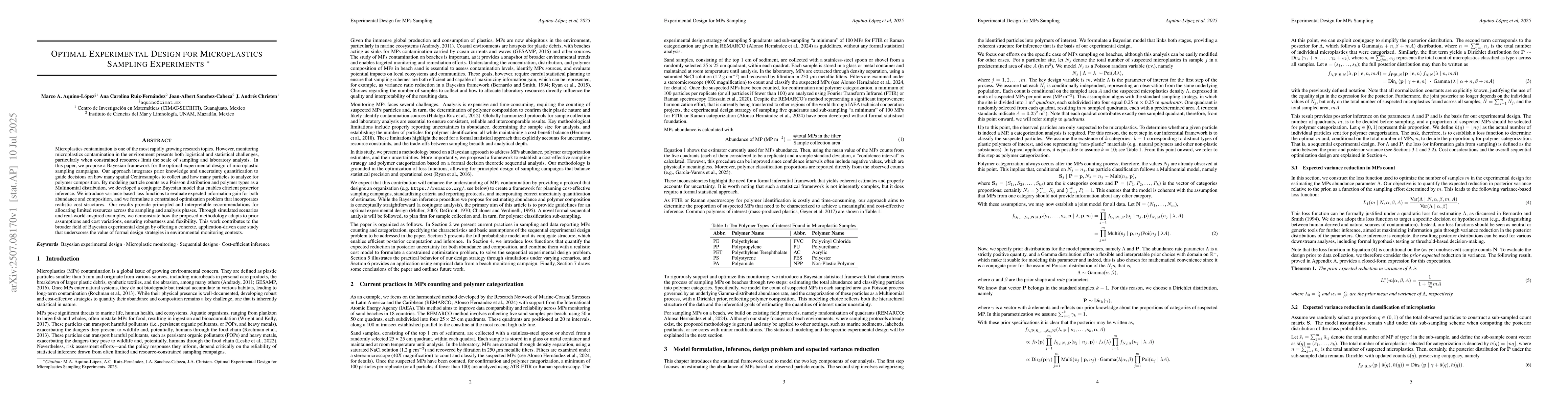 Microplastics contamination is one of the most rapidly growing research topics. However, monitoring microplastics contamination in the environment presents both logistical and statistical challenges, particularly when constrained resources limit the scale of sampling and laboratory analysis. In this paper, we propose a Bayesian framework for the optimal experimental design of microplastic sampling campaigns. Our approach integrates prior knowledge and uncertainty quantification to guide decisions on how many spatial Centrosamples to collect and how many particles to analyze for polymer composition. By modeling particle counts as a Poisson distribution and polymer types as a Multinomial distribution, we developed a conjugate Bayesian model that enables efficient posterior inference. We introduce variance-based loss functions to evaluate expected information gain for both abundance and composition, and we formulate a constrained optimization problem that incorporates realistic cost structures. Our results provide principled and interpretable recommendations for allocating limited resources across the sampling and analysis phases. Through simulated scenarios and real-world-inspired examples, we demonstrate how the proposed methodology adapts to prior assumptions and cost variations, ensuring robustness and flexibility. This work contributes to the broader field of Bayesian experimental design by offering a concrete, application-driven case study that underscores the value of formal design strategies in environmental monitoring contexts.