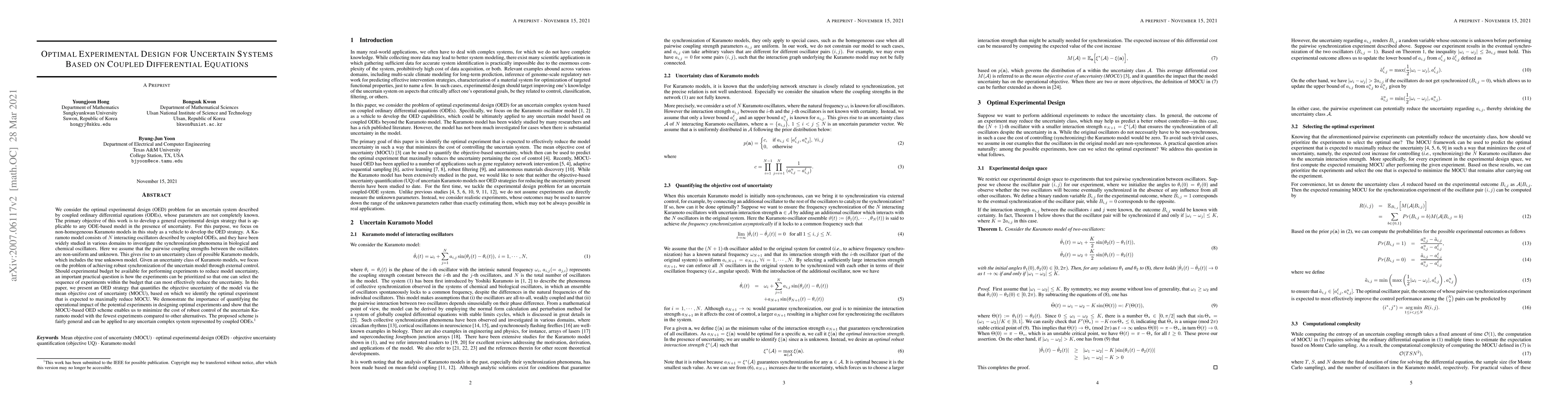 This paper addresses the optimal experimental design for an uncertain Kuramoto model, focusing on reducing uncertainty in coupling strengths between N interacting oscillators. It emphasizes the importance of quantifying operational impacts to minimize the cost of robust control.