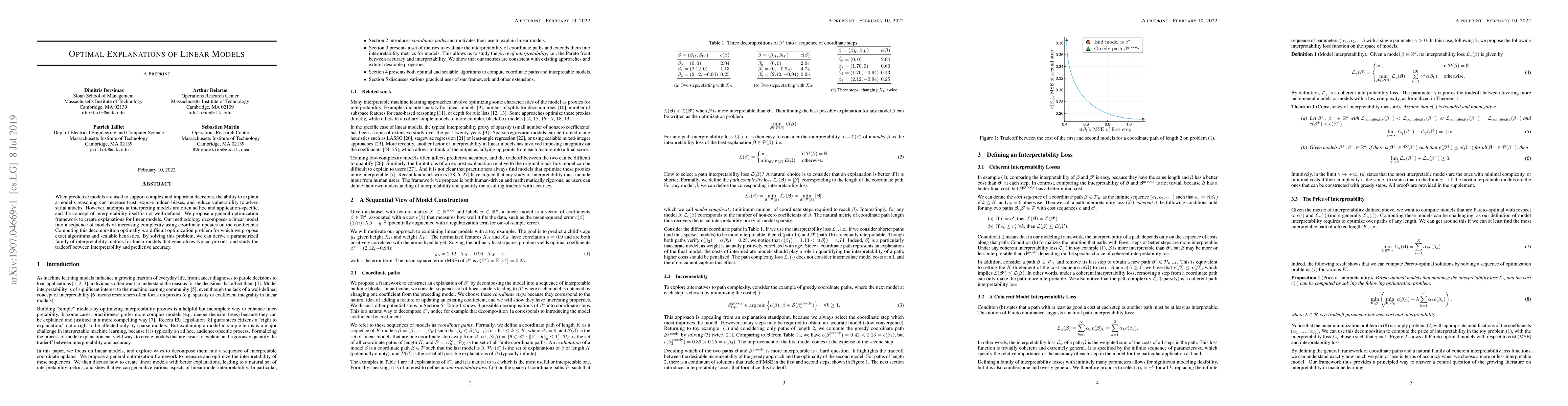 When predictive models are used to support complex and important decisions, the ability to explain a model's reasoning can increase trust, expose hidden biases, and reduce vulnerability to adversarial attacks. However, attempts at interpreting models are often ad hoc and application-specific, and the concept of interpretability itself is not well-defined. We propose a general optimization framework to create explanations for linear models. Our methodology decomposes a linear model into a sequence of models of increasing complexity using coordinate updates on the coefficients. Computing this decomposition optimally is a difficult optimization problem for which we propose exact algorithms and scalable heuristics. By solving this problem, we can derive a parametrized family of interpretability metrics for linear models that generalizes typical proxies, and study the tradeoff between interpretability and predictive accuracy.
