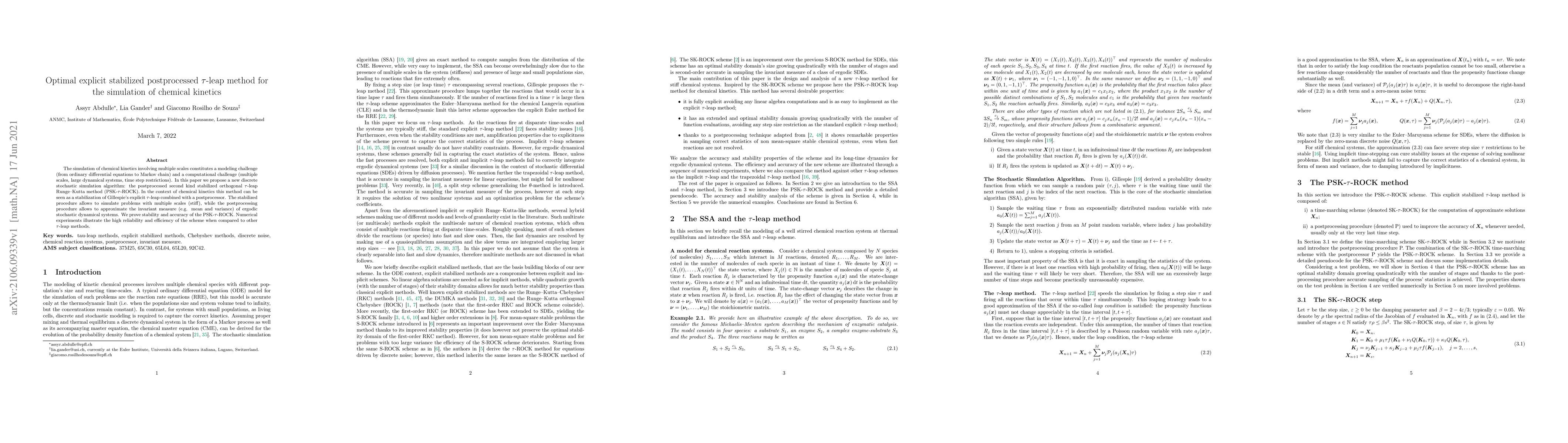 The simulation of chemical kinetics involving multiple scales constitutes a modeling challenge (from ordinary differential equations to Markov chain) and a computational challenge (multiple scales, large dynamical systems, time step restrictions). In this paper we propose a new discrete stochastic simulation algorithm: the postprocessed second kind stabilized orthogonal $\tau$-leap Runge-Kutta method (PSK-$\tau$-ROCK). In the context of chemical kinetics this method can be seen as a stabilization of Gillespie's explicit $\tau$-leap combined with a postprocessor. The stabilized procedure allows to simulate problems with multiple scales (stiff), while the postprocessing procedure allows to approximate the invariant measure (e.g. mean and variance) of ergodic stochastic dynamical systems. We prove stability and accuracy of the PSK-$\tau$-ROCK. Numerical experiments illustrate the high reliability and efficiency of the scheme when compared to other $\tau$-leap methods.