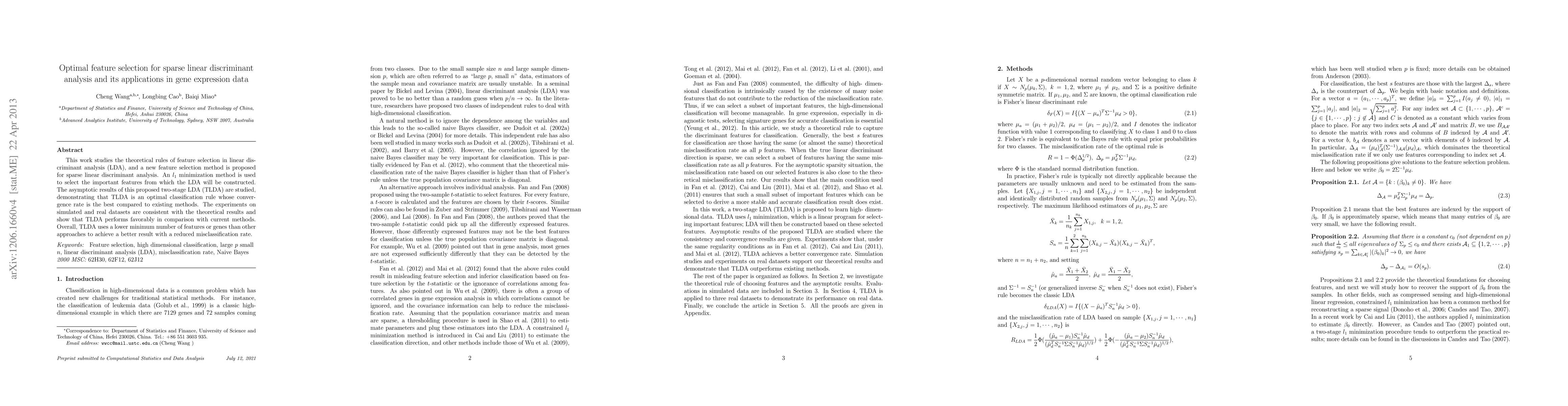 This paper proposes a new feature selection method for sparse linear discriminant analysis (LDA) using $l_1$ minimization, termed two-stage LDA (TLDA), which demonstrates optimal classification performance and superior convergence compared to existing methods. Experiments on both simulated and real gene expression datasets show TLDA's effectiveness in achieving better results with fewer features.